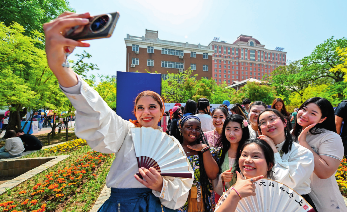 中外青年在以“上合之約 天外同彩”為主題的天津外國(guó)語(yǔ)大學(xué)第八屆國(guó)際文化節(jié)上合影留念(2025年4月20日攝)孫凡越攝/本刊