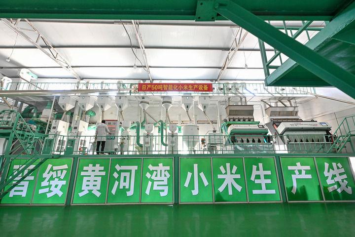 2025年7月1日拍攝的山西省呂梁市興縣晉綏黃河灣農(nóng)業(yè)開(kāi)發(fā)有限公司的小米生產(chǎn)線??箲?zhàn)時(shí)期,地處晉西北地區(qū)的興縣和靜樂(lè)縣是晉綏抗日根據(jù)地的一部分。新華社記者 李鑫 攝
