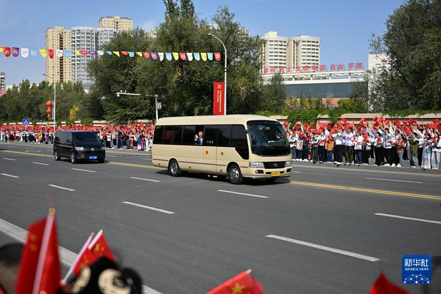 9月23日下午,中共中央總書記、國(guó)家主席、中央軍委主席習(xí)近平率中央代表團(tuán)乘專機(jī)抵達(dá)烏魯木齊,出席新疆維吾爾自治區(qū)成立70周年慶?;顒?dòng)。這是從機(jī)場(chǎng)到住地途中,習(xí)近平向沿途歡迎的群眾揮手致意。新華社記者 辛悅衛(wèi) 攝