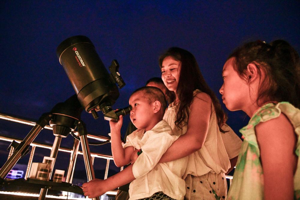 2025年7月9日,游客在貴州省平塘縣克度“天文小鎮(zhèn)”通過(guò)望遠(yuǎn)鏡觀測(cè)星空。近年來(lái),隨著旅游設(shè)施逐漸完善,距離“中國(guó)天眼”僅8公里的克度“天文小鎮(zhèn)”通過(guò)“科普+文旅”發(fā)展模式,帶動(dòng)村民就業(yè)創(chuàng)業(yè)、增收致富。2025年1月至6月,“中國(guó)天眼”景區(qū)共接待游客約38萬(wàn)人次,總收入2496萬(wàn)余元。