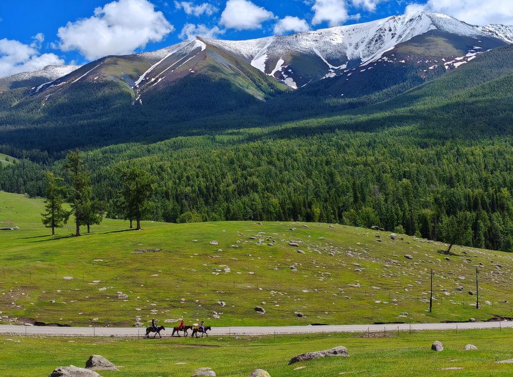 2024年6月4日,游客在新疆阿勒泰地區(qū)哈巴河縣騎馬游玩。電視劇《我的阿勒泰》播出后,新疆阿勒泰地區(qū)迎來(lái)客流高峰,“張鳳俠的小賣(mài)部”“巴太樹(shù)”“彩虹布拉克”等劇中地點(diǎn)成為熱門(mén)旅游打卡地。這場(chǎng)“邊城”與“熱劇”雙向奔赴的文旅盛宴,為當(dāng)?shù)亟?jīng)濟(jì)發(fā)展帶來(lái)新的增長(zhǎng)點(diǎn)。2024年5月,當(dāng)?shù)亟哟慰?15.03萬(wàn)人次,同比增長(zhǎng)60.81%;實(shí)現(xiàn)旅游收入36.53億元,同比增長(zhǎng)88.25%。
