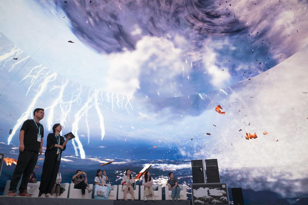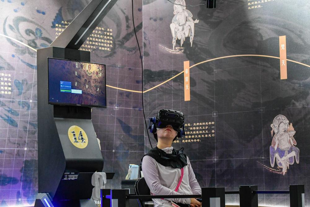 2024年7月22日,游客在“尋境敦煌——數(shù)字敦煌沉浸展”借助VR設(shè)備沉浸式游覽莫高窟第285窟虛擬場(chǎng)景?!皩ぞ扯鼗汀獢?shù)字敦煌沉浸展”綜合運(yùn)用VR虛擬現(xiàn)實(shí)、三維建模、游戲引擎的物理渲染和全局動(dòng)態(tài)光照等新技術(shù),高精度立體還原了莫高窟第285窟。游客戴上VR眼鏡,不僅可以零距離觀賞壁畫(huà)、360度自由探索洞窟細(xì)節(jié),還能“飛升”到窟頂,身臨其境參與壁畫(huà)故事情節(jié),沉浸式感受敦煌文化的魅力。