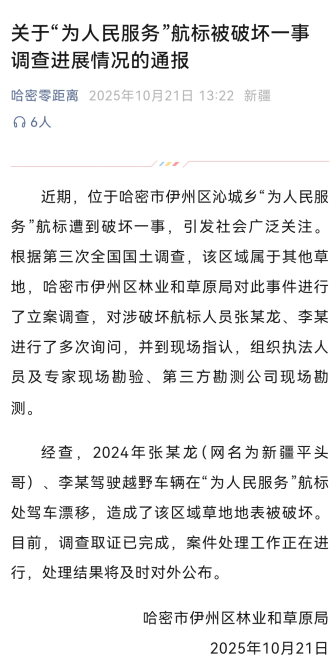 10月21日,新疆哈密市伊州區(qū)林業(yè)和草原局對外發(fā)布:近期,位于哈密市伊州區(qū)沁城鄉(xiāng)“為人民服務(wù)”航標遭到破壞一事,引發(fā)社會廣泛關(guān)注。根據(jù)第三次全國國土調(diào)查,該區(qū)域?qū)儆谄渌莸?,哈密市伊州區(qū)林業(yè)和草原局對此事件進行了立案調(diào)查,對涉破壞航標人員張某龍、李某進行了多次詢問,并到現(xiàn)場指認,組織執(zhí)法人員及專家現(xiàn)場勘驗、第三方勘測公司現(xiàn)場勘測。