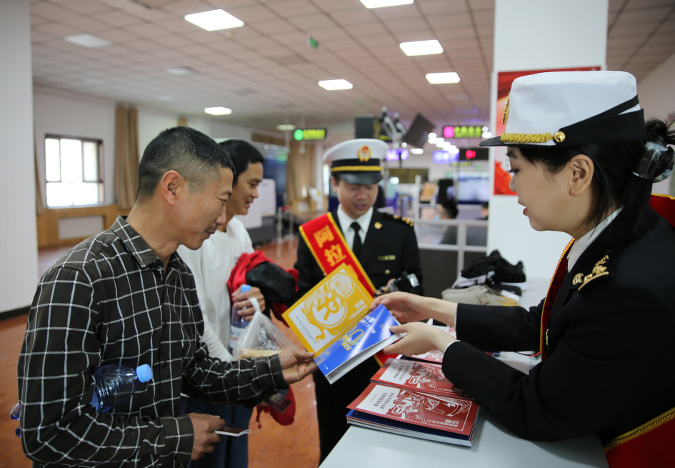 圖為阿拉山口海關關員正在向旅客宣傳知識產(chǎn)權(quán)海關保護相關法律法規(guī)知識。