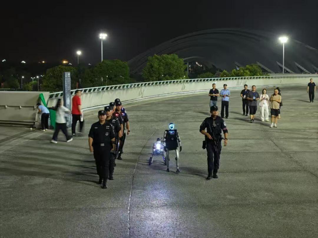 人形機器人、機器狗配合安保民警在蘇超賽場開展巡邏