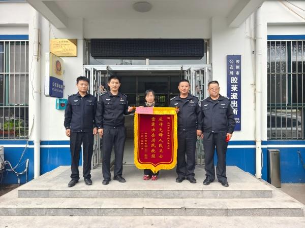 10月20日,翟女士來(lái)到膠萊派出所將被騙的16萬(wàn)元領(lǐng)回,并特地將一面寫(xiě)有“反詐先鋒人民衛(wèi)士 雷霆出擊為民挽損”字樣的錦旗送到民警的手中,以此向幫助自己挽回?fù)p失的民警表達(dá)謝意。