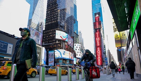 11月18日,行人走在美國紐約時報廣場。新華社記者 王迎 攝