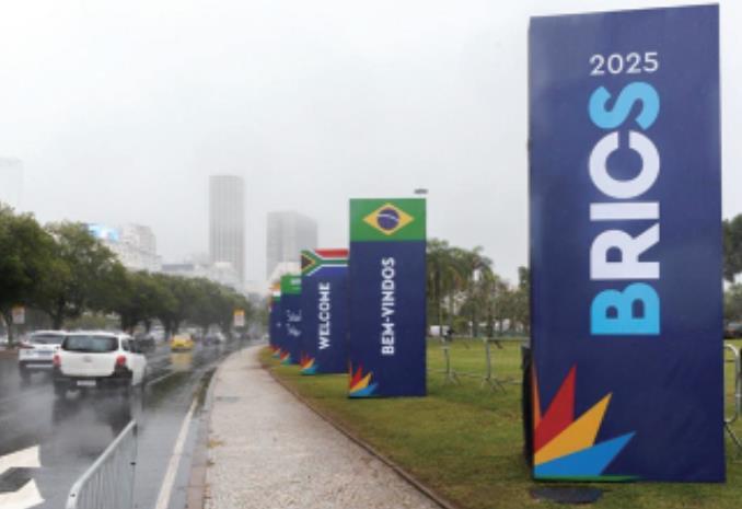 圖為7月3日在巴西里約熱內(nèi)盧拍攝的金磚國家領(lǐng)導(dǎo)人第十七次會晤歡迎標語牌。 新華社發(fā)