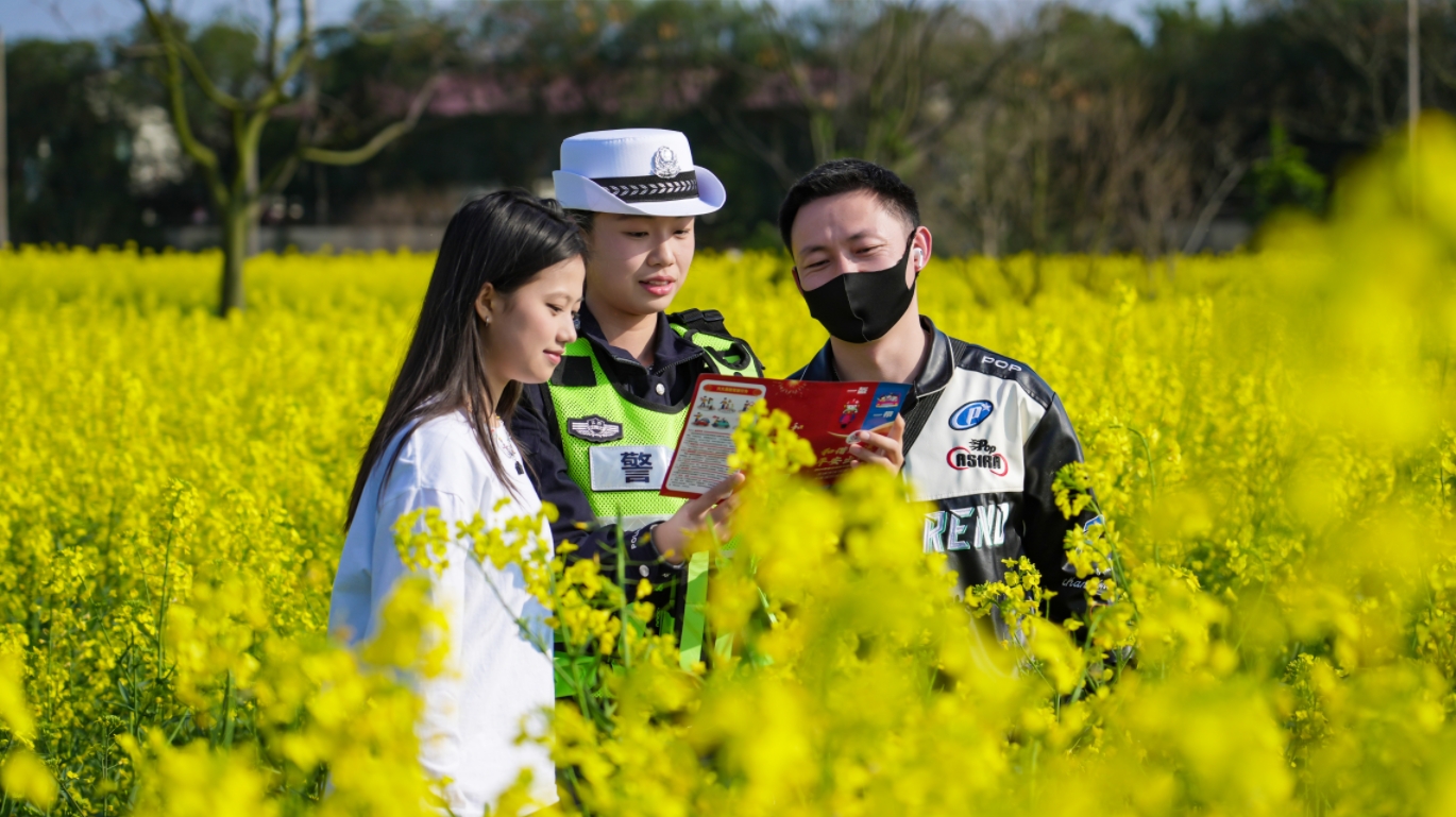 陽春三月,江西省新余市數(shù)萬畝油菜花競相綻放,吸引大批游客前來打卡拍照。新余市公安局交警支隊加強警力調(diào)度,開展巡邏防控,疏導交通秩序,并組織民警面對面向游客宣講交通安全法規(guī)。