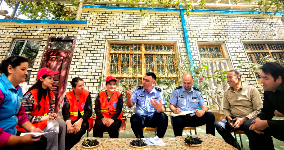 麥麥提艾麥爾和同事經(jīng)常給“石榴大媽”們上課,講法律法規(guī)、惠民政策,教反詐防騙、風險防范知識,“石榴大媽”們接著講給鄉(xiāng)親們聽,帶著他們干。如今,村里鬧心事少了,歡笑聲多了。