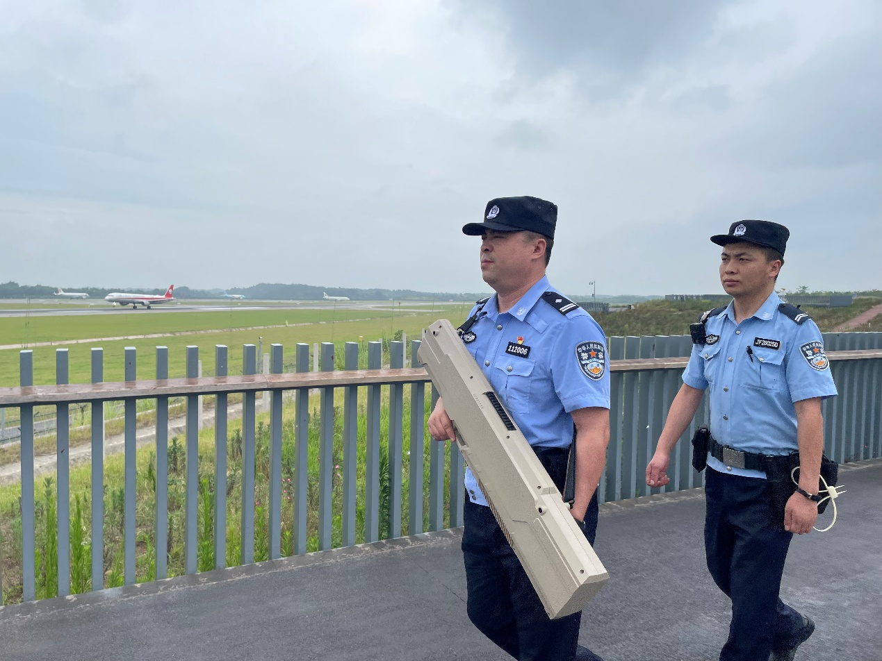 天府國際機(jī)場跑道一側(cè)的萌獅公園,是觀看飛機(jī)起降、一覽機(jī)場全貌的最佳地點,吸引了不少游客前來拍照打卡。7月18日,東部新區(qū)公安分局草池派出所的民輔警背著分局配發(fā)的無人機(jī)反制槍,與“凈空觀察哨”隊員在公園里開展巡邏工作:檢查機(jī)場防護(hù)網(wǎng)是否遭到破壞,在觀察哨瞭望是否有風(fēng)箏、氣球等升空物體干擾航班的情況,向游客進(jìn)行凈空安全知識的宣傳。