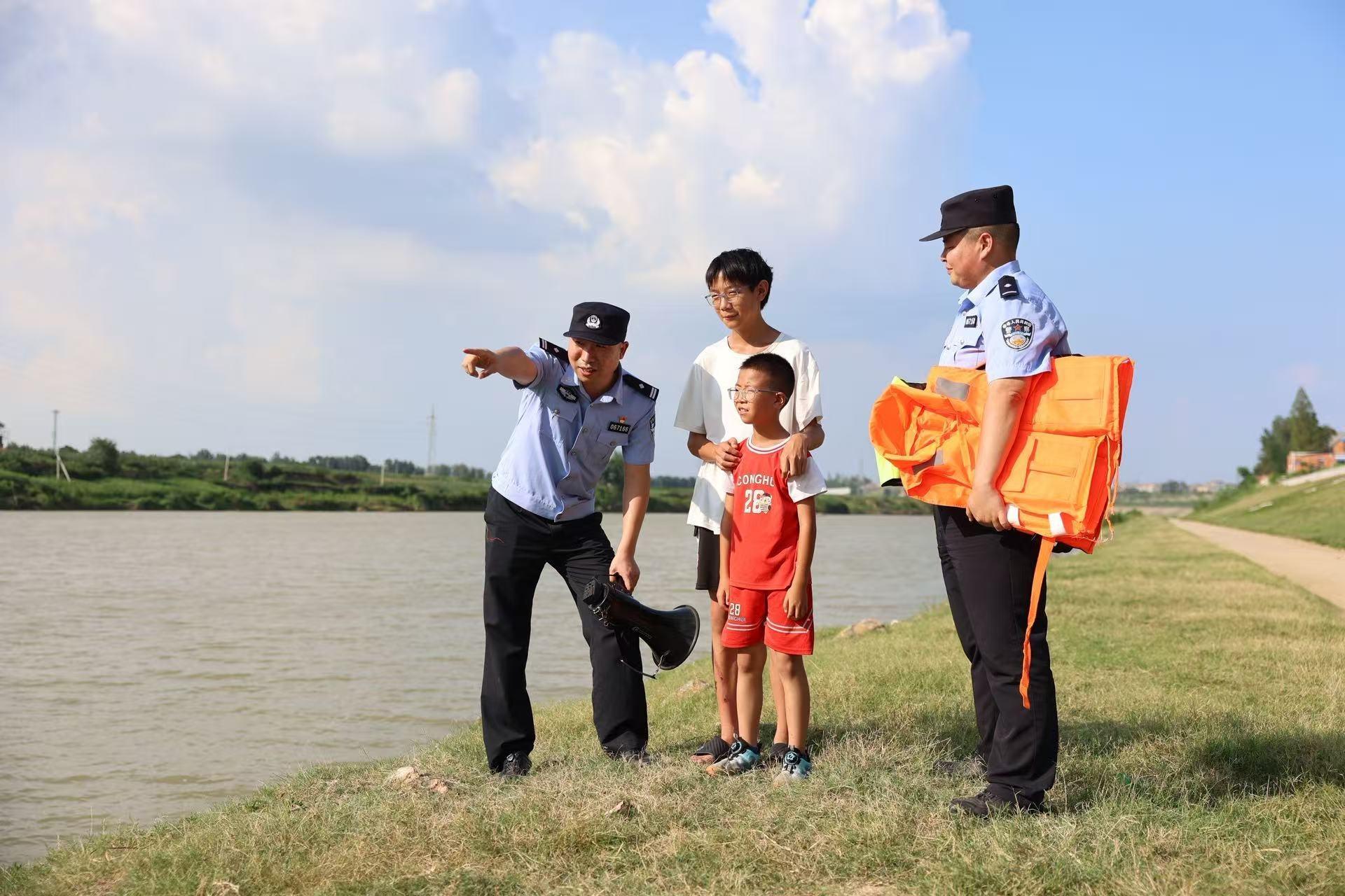 7月18日,湖北省襄陽(yáng)市公安局襄州區(qū)分局雙溝派出所民警輔警在轄區(qū)內(nèi)開(kāi)展防溺水巡查、宣傳勸導(dǎo)工作。圖為民輔警在水域邊向群眾宣傳防溺水常識(shí)。