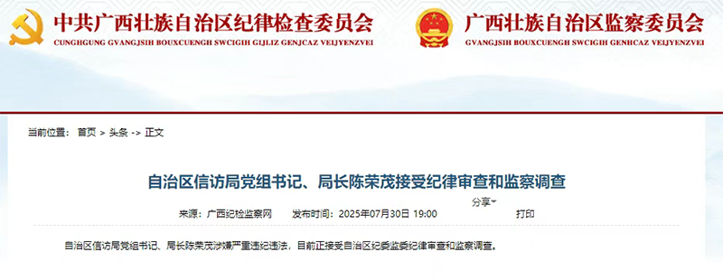 廣西紀(jì)檢監(jiān)察網(wǎng)7月30日下午發(fā)布消息:自治區(qū)信訪局黨組書記、局長(zhǎng)陳榮茂涉嫌嚴(yán)重違紀(jì)違法,目前正接受自治區(qū)紀(jì)委監(jiān)委紀(jì)律審查和監(jiān)察調(diào)查。