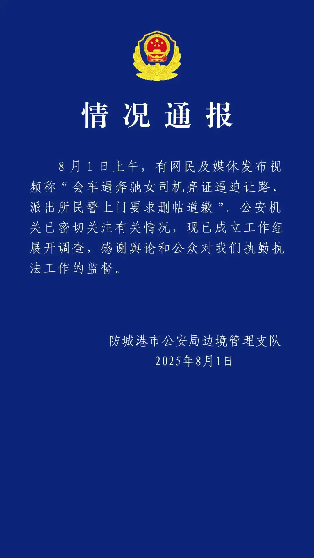 8月1日晚,防城港市公安局邊境管理支隊(duì)發(fā)布情況通報(bào):8月1日上午,有網(wǎng)民及媒體發(fā)布視頻稱(chēng)“會(huì)車(chē)遇奔馳女司機(jī)亮證逼迫讓路、派出所民警上門(mén)要求刪帖道歉”。公安機(jī)關(guān)已密切關(guān)注有關(guān)情況,現(xiàn)已成立工作組展開(kāi)調(diào)查,感謝輿論和公眾對(duì)我們執(zhí)勤執(zhí)法工作的監(jiān)督。