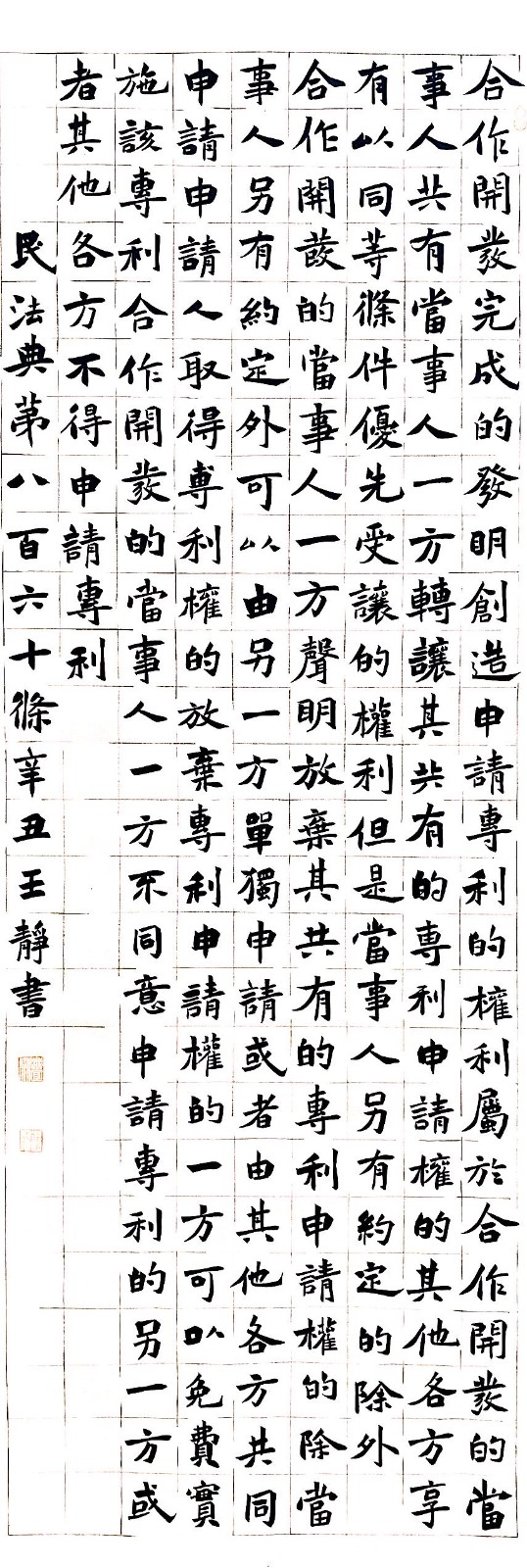 民法典第八百六十條 合作開發(fā)完成的發(fā)明創(chuàng)造,申請專利的權(quán)利屬于合作開發(fā)的當(dāng)事人共有;當(dāng)事人一方轉(zhuǎn)讓其共有的專利申請權(quán)的,其他各方享有以同等條件優(yōu)先受讓的權(quán)利。但是,當(dāng)事人另有約定的除外。