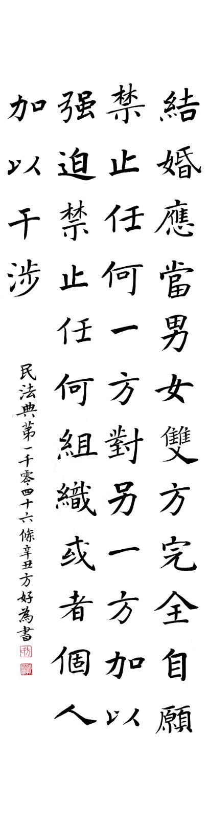 民法典第一千零四十六條 結婚應當男女雙方完全自愿,禁止任何一方對另一方加以強迫,禁止任何組織或者個人加以干涉。