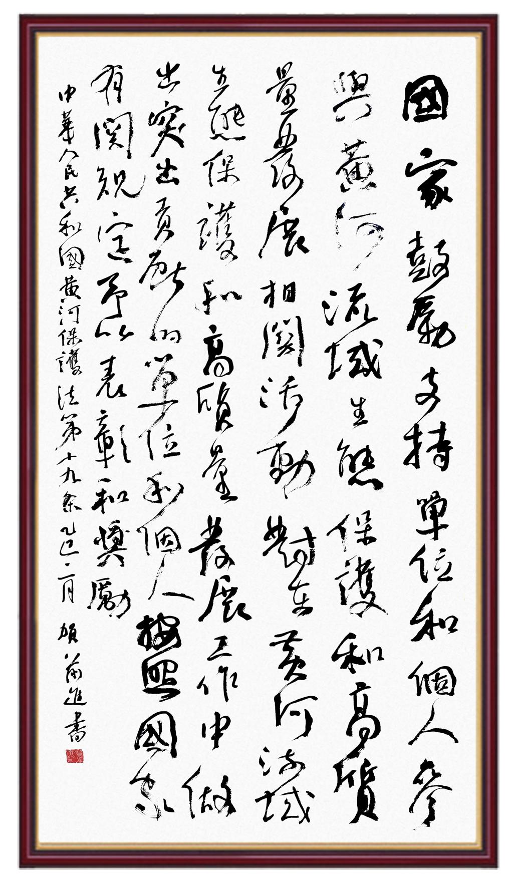 黃河寧,天下平。黃河是中華民族的發(fā)源地和搖籃,保護(hù)黃河是事關(guān)中華民族偉大復(fù)興的千秋大計(jì)。《中華人民共和國(guó)黃河保護(hù)法》為推進(jìn)水資源節(jié)約集約利用、保護(hù)傳承弘揚(yáng)黃河文化、推動(dòng)黃河流域生態(tài)保護(hù)和高質(zhì)量發(fā)展提供了有力法治保障。繼書寫《中華人民共和國(guó)民法典》《中華人民共和國(guó)憲法》《中華人民共和國(guó)澳門特別行政區(qū)基本法》《中華人民共和國(guó)香港特別行政區(qū)基本法》《中華人民共和國(guó)國(guó)旗法》《中華人民共和國(guó)國(guó)徽法》《中華人民共和國(guó)國(guó)歌法》《中華人民共和國(guó)法官法》等法律法規(guī)之后,法制日?qǐng)?bào)社聯(lián)合沿黃九省(區(qū))司法廳、書法家協(xié)會(huì),將筆端對(duì)準(zhǔn)《中華人民共和國(guó)黃河保護(hù)法》。