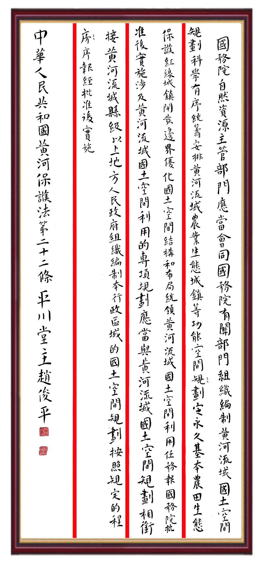 黃河寧,天下平。黃河是中華民族的發(fā)源地和搖籃,保護(hù)黃河是事關(guān)中華民族偉大復(fù)興的千秋大計(jì)?!吨腥A人民共和國(guó)黃河保護(hù)法》為推進(jìn)水資源節(jié)約集約利用、保護(hù)傳承弘揚(yáng)黃河文化、推動(dòng)黃河流域生態(tài)保護(hù)和高質(zhì)量發(fā)展提供了有力法治保障。繼書寫《中華人民共和國(guó)民法典》《中華人民共和國(guó)憲法》《中華人民共和國(guó)澳門特別行政區(qū)基本法》《中華人民共和國(guó)香港特別行政區(qū)基本法》《中華人民共和國(guó)國(guó)旗法》《中華人民共和國(guó)國(guó)徽法》《中華人民共和國(guó)國(guó)歌法》《中華人民共和國(guó)法官法》等法律法規(guī)之后,法制日?qǐng)?bào)社聯(lián)合沿黃九?。▍^(qū))司法廳、書法家協(xié)會(huì),將筆端對(duì)準(zhǔn)《中華人民共和國(guó)黃河保護(hù)法》。