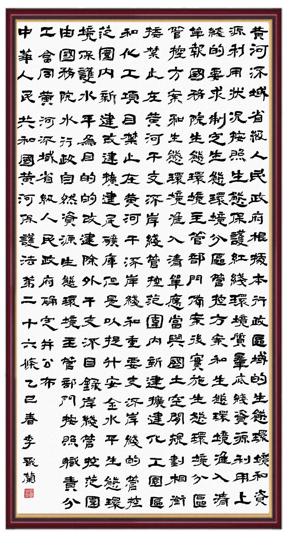 黃河寧,天下平。黃河是中華民族的發(fā)源地和搖籃,保護黃河是事關(guān)中華民族偉大復興的千秋大計?!吨腥A人民共和國黃河保護法》為推進水資源節(jié)約集約利用、保護傳承弘揚黃河文化、推動黃河流域生態(tài)保護和高質(zhì)量發(fā)展提供了有力法治保障。繼書寫《中華人民共和國民法典》《中華人民共和國憲法》《中華人民共和國澳門特別行政區(qū)基本法》《中華人民共和國香港特別行政區(qū)基本法》《中華人民共和國國旗法》《中華人民共和國國徽法》《中華人民共和國國歌法》《中華人民共和國法官法》等法律法規(guī)之后,法制日報社聯(lián)合沿黃九省(區(qū))司法廳、書法家協(xié)會,將筆端對準《中華人民共和國黃河保護法》。