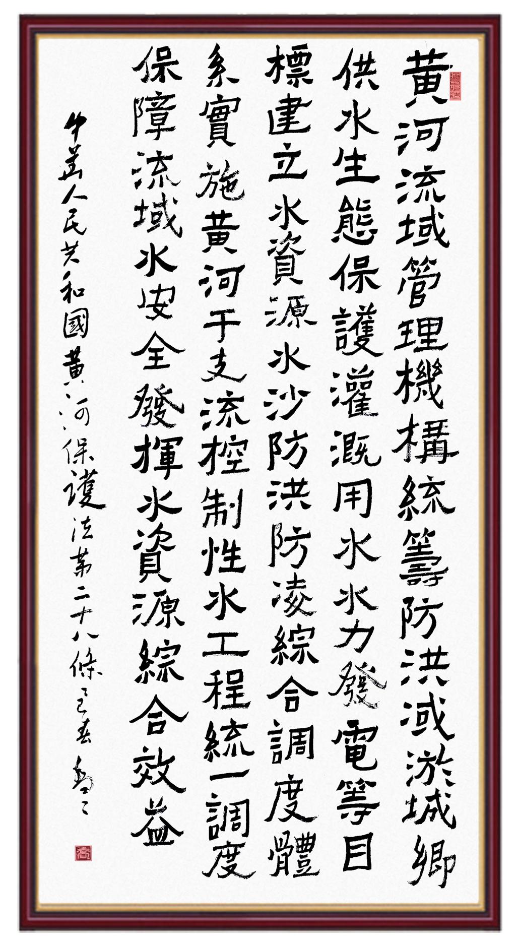 黃河寧,天下平。黃河是中華民族的發(fā)源地和搖籃,保護(hù)黃河是事關(guān)中華民族偉大復(fù)興的千秋大計?!吨腥A人民共和國黃河保護(hù)法》為推進(jìn)水資源節(jié)約集約利用、保護(hù)傳承弘揚黃河文化、推動黃河流域生態(tài)保護(hù)和高質(zhì)量發(fā)展提供了有力法治保障。繼書寫《中華人民共和國民法典》《中華人民共和國憲法》《中華人民共和國澳門特別行政區(qū)基本法》《中華人民共和國香港特別行政區(qū)基本法》《中華人民共和國國旗法》《中華人民共和國國徽法》《中華人民共和國國歌法》《中華人民共和國法官法》等法律法規(guī)之后,法制日報社聯(lián)合沿黃九?。▍^(qū))司法廳、書法家協(xié)會,將筆端對準(zhǔn)《中華人民共和國黃河保護(hù)法》。