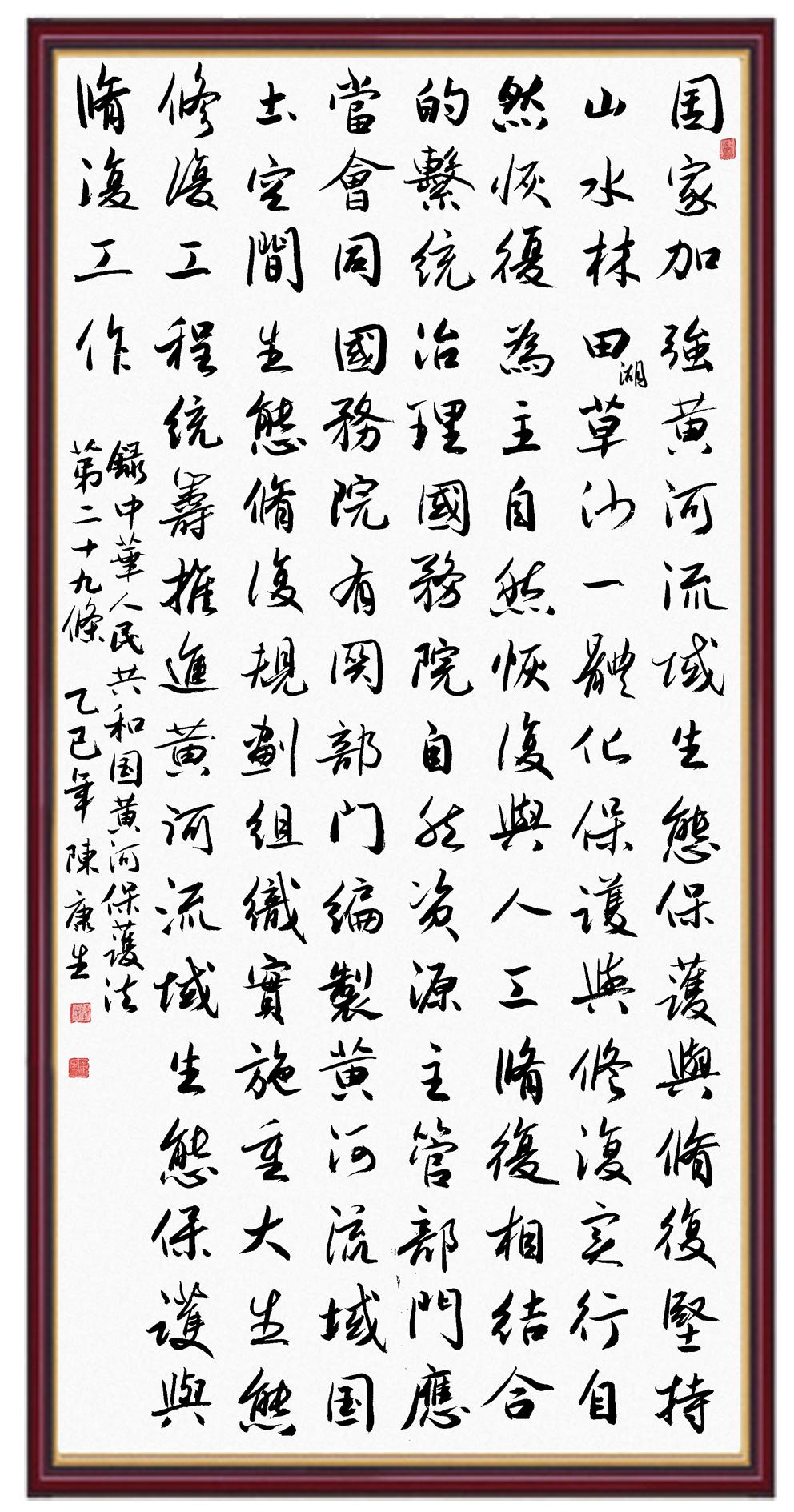 黃河寧,天下平。黃河是中華民族的發(fā)源地和搖籃,保護(hù)黃河是事關(guān)中華民族偉大復(fù)興的千秋大計(jì)?!吨腥A人民共和國黃河保護(hù)法》為推進(jìn)水資源節(jié)約集約利用、保護(hù)傳承弘揚(yáng)黃河文化、推動(dòng)黃河流域生態(tài)保護(hù)和高質(zhì)量發(fā)展提供了有力法治保障。繼書寫《中華人民共和國民法典》《中華人民共和國憲法》《中華人民共和國澳門特別行政區(qū)基本法》《中華人民共和國香港特別行政區(qū)基本法》《中華人民共和國國旗法》《中華人民共和國國徽法》《中華人民共和國國歌法》《中華人民共和國法官法》等法律法規(guī)之后,法制日?qǐng)?bào)社聯(lián)合沿黃九省(區(qū))司法廳、書法家協(xié)會(huì),將筆端對(duì)準(zhǔn)《中華人民共和國黃河保護(hù)法》。