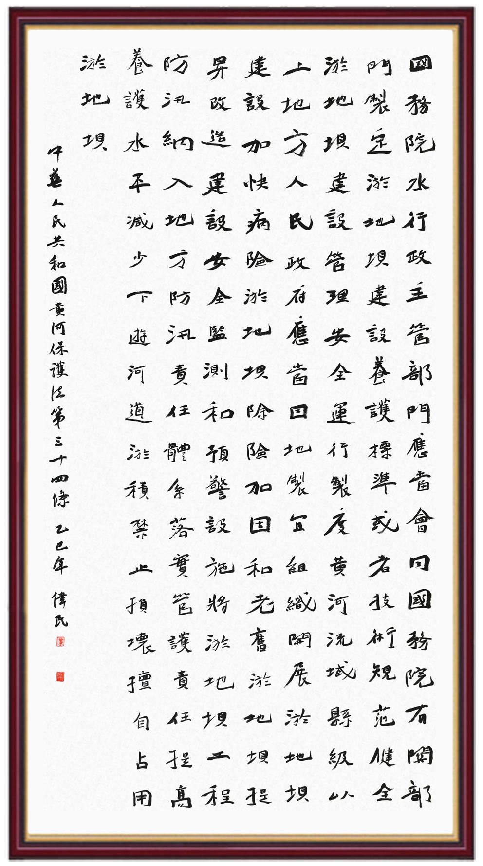 黃河寧,天下平。黃河是中華民族的發(fā)源地和搖籃,保護(hù)黃河是事關(guān)中華民族偉大復(fù)興的千秋大計(jì)?!吨腥A人民共和國(guó)黃河保護(hù)法》為推進(jìn)水資源節(jié)約集約利用、保護(hù)傳承弘揚(yáng)黃河文化、推動(dòng)黃河流域生態(tài)保護(hù)和高質(zhì)量發(fā)展提供了有力法治保障。繼書(shū)寫(xiě)《中華人民共和國(guó)民法典》《中華人民共和國(guó)憲法》《中華人民共和國(guó)澳門(mén)特別行政區(qū)基本法》《中華人民共和國(guó)香港特別行政區(qū)基本法》《中華人民共和國(guó)國(guó)旗法》《中華人民共和國(guó)國(guó)徽法》《中華人民共和國(guó)國(guó)歌法》《中華人民共和國(guó)法官法》等法律法規(guī)之后,法制日?qǐng)?bào)社聯(lián)合沿黃九?。▍^(qū))司法廳、書(shū)法家協(xié)會(huì),將筆端對(duì)準(zhǔn)《中華人民共和國(guó)黃河保護(hù)法》。