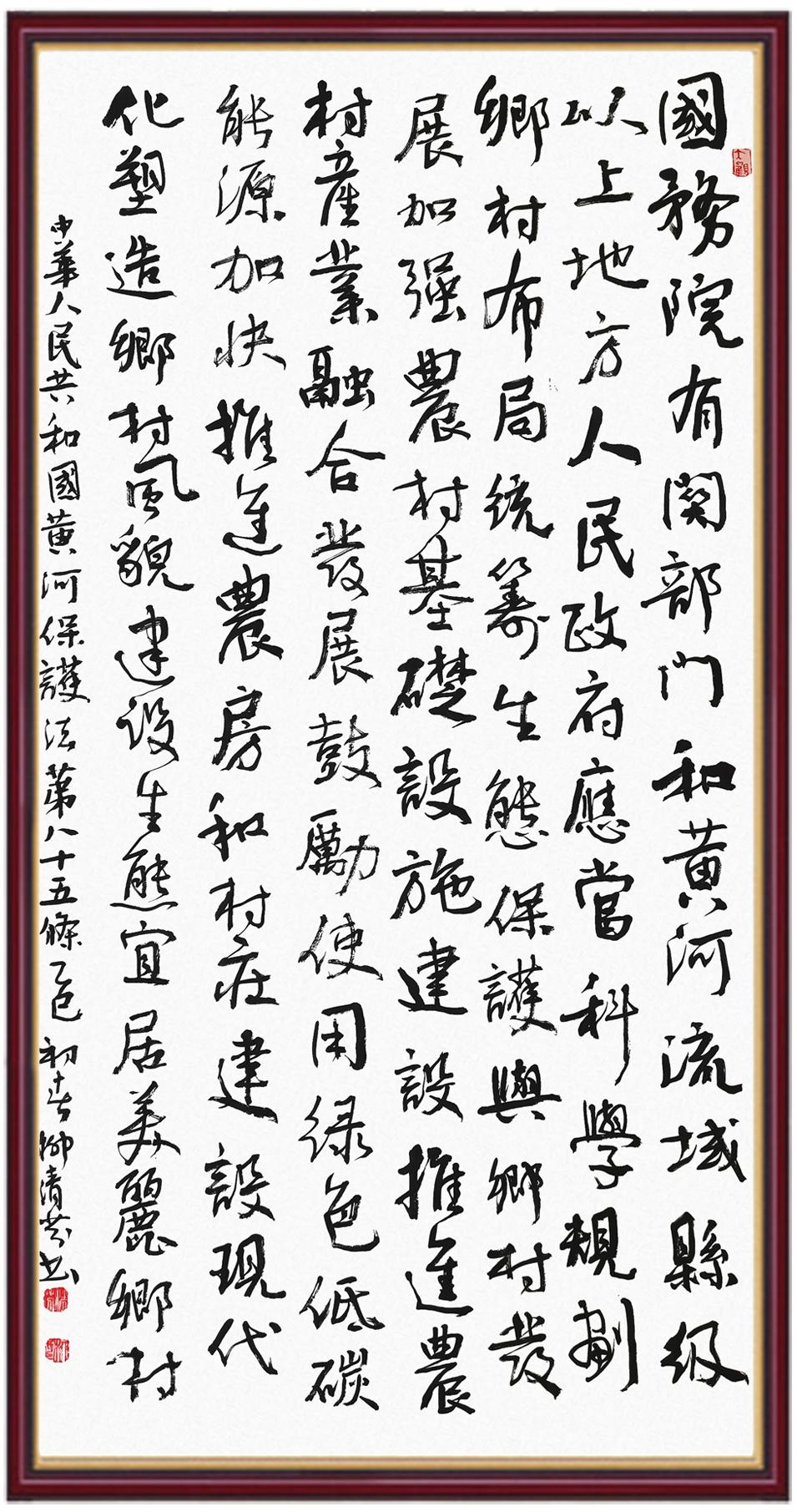 黃河寧,天下平。黃河是中華民族的發(fā)源地和搖籃,保護黃河是事關(guān)中華民族偉大復(fù)興的千秋大計?!吨腥A人民共和國黃河保護法》為推進水資源節(jié)約集約利用、保護傳承弘揚黃河文化、推動黃河流域生態(tài)保護和高質(zhì)量發(fā)展提供了有力法治保障。繼書寫《中華人民共和國民法典》《中華人民共和國憲法》《中華人民共和國澳門特別行政區(qū)基本法》《中華人民共和國香港特別行政區(qū)基本法》《中華人民共和國國旗法》《中華人民共和國國徽法》《中華人民共和國國歌法》《中華人民共和國法官法》等法律法規(guī)之后,法制日報社聯(lián)合沿黃九?。▍^(qū))司法廳、書法家協(xié)會,將筆端對準(zhǔn)《中華人民共和國黃河保護法》。
