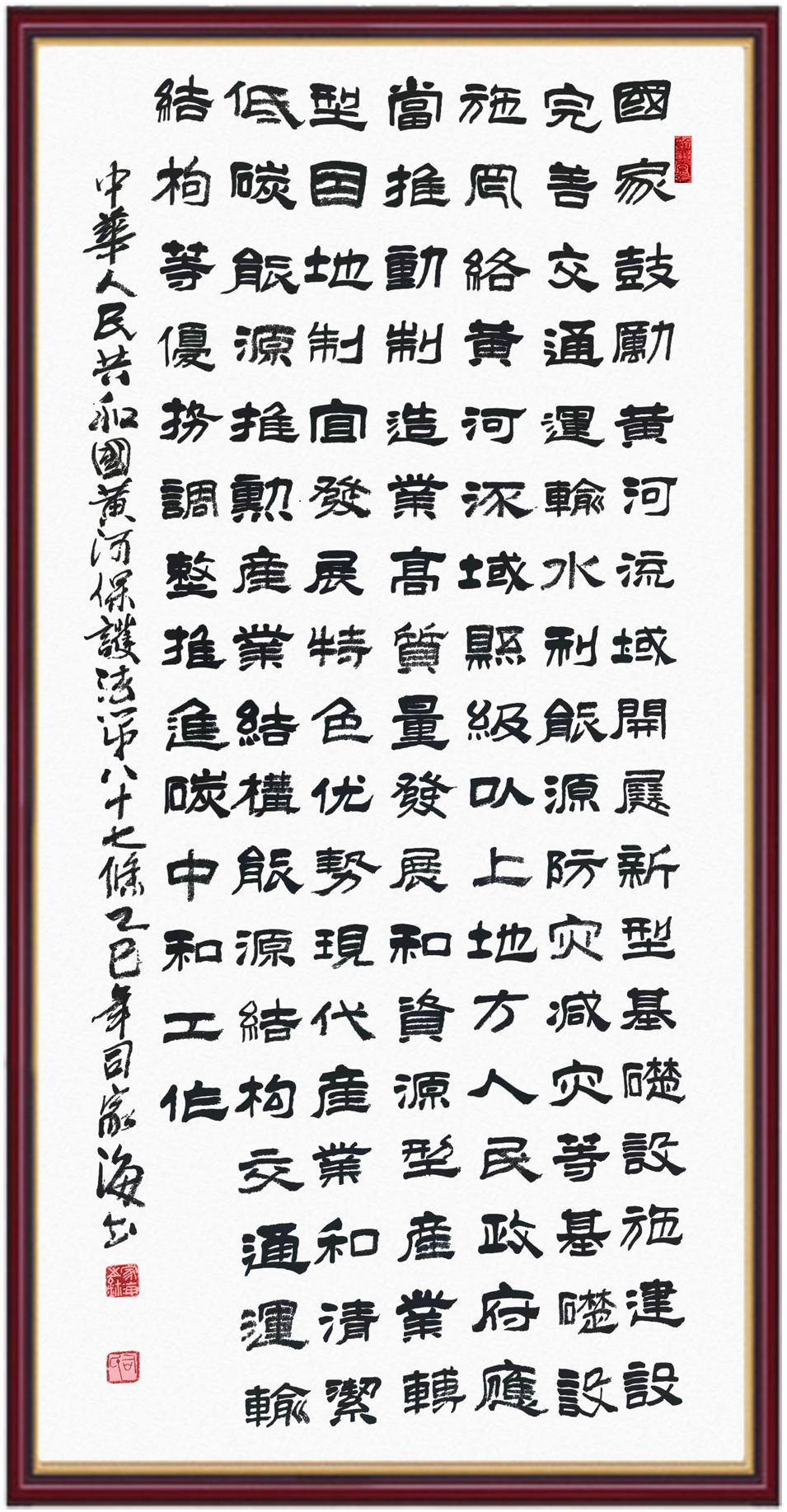 黃河寧,天下平。黃河是中華民族的發(fā)源地和搖籃,保護(hù)黃河是事關(guān)中華民族偉大復(fù)興的千秋大計(jì)?!吨腥A人民共和國(guó)黃河保護(hù)法》為推進(jìn)水資源節(jié)約集約利用、保護(hù)傳承弘揚(yáng)黃河文化、推動(dòng)黃河流域生態(tài)保護(hù)和高質(zhì)量發(fā)展提供了有力法治保障。繼書寫《中華人民共和國(guó)民法典》《中華人民共和國(guó)憲法》《中華人民共和國(guó)澳門特別行政區(qū)基本法》《中華人民共和國(guó)香港特別行政區(qū)基本法》《中華人民共和國(guó)國(guó)旗法》《中華人民共和國(guó)國(guó)徽法》《中華人民共和國(guó)國(guó)歌法》《中華人民共和國(guó)法官法》等法律法規(guī)之后,法制日?qǐng)?bào)社聯(lián)合沿黃九?。▍^(qū))司法廳、書法家協(xié)會(huì),將筆端對(duì)準(zhǔn)《中華人民共和國(guó)黃河保護(hù)法》。