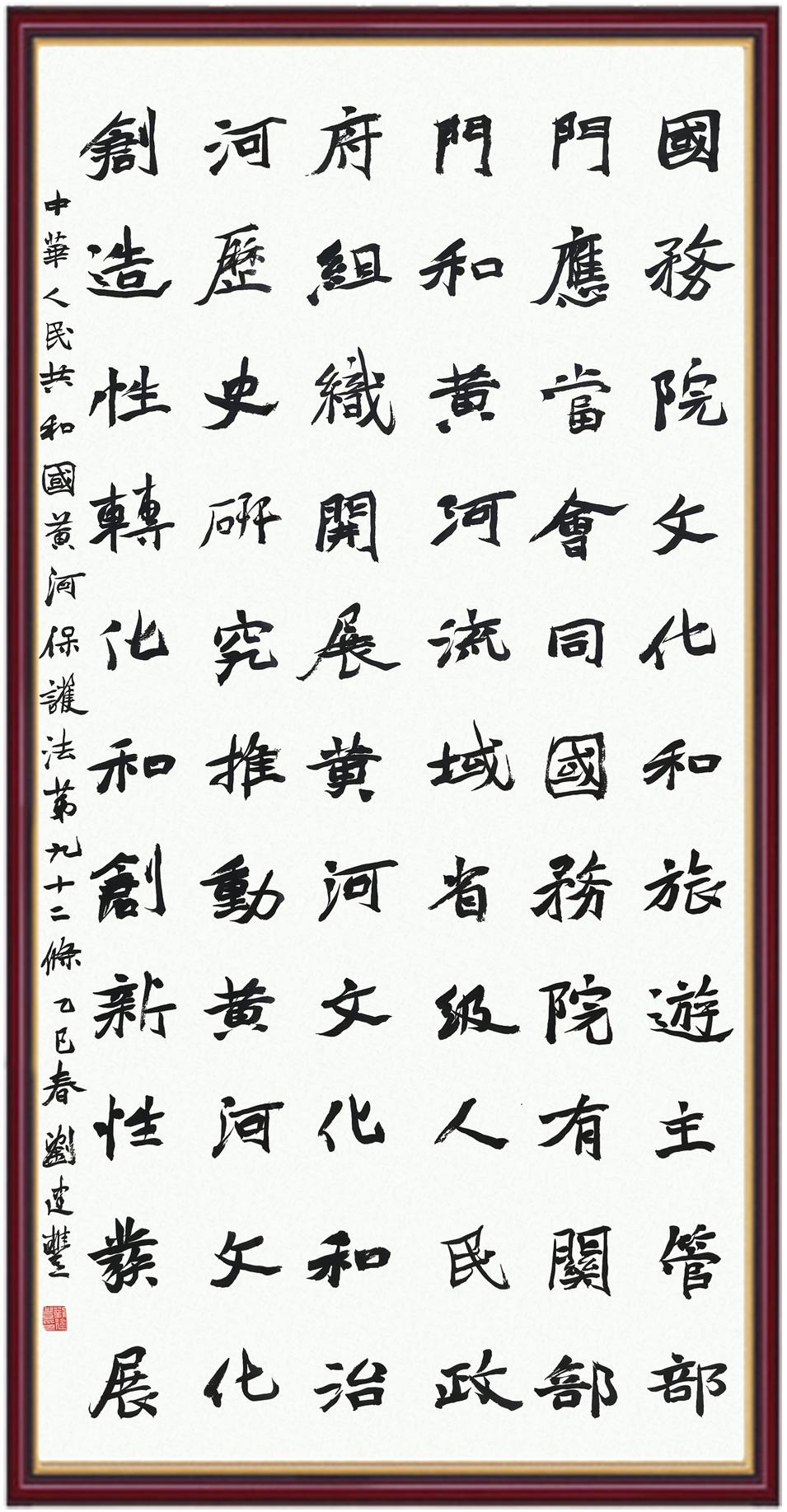 黃河寧,天下平。黃河是中華民族的發(fā)源地和搖籃,保護(hù)黃河是事關(guān)中華民族偉大復(fù)興的千秋大計(jì)。《中華人民共和國黃河保護(hù)法》為推進(jìn)水資源節(jié)約集約利用、保護(hù)傳承弘揚(yáng)黃河文化、推動(dòng)黃河流域生態(tài)保護(hù)和高質(zhì)量發(fā)展提供了有力法治保障。繼書寫《中華人民共和國民法典》《中華人民共和國憲法》《中華人民共和國澳門特別行政區(qū)基本法》《中華人民共和國香港特別行政區(qū)基本法》《中華人民共和國國旗法》《中華人民共和國國徽法》《中華人民共和國國歌法》《中華人民共和國法官法》等法律法規(guī)之后,法制日報(bào)社聯(lián)合沿黃九?。▍^(qū))司法廳、書法家協(xié)會(huì),將筆端對(duì)準(zhǔn)《中華人民共和國黃河保護(hù)法》。