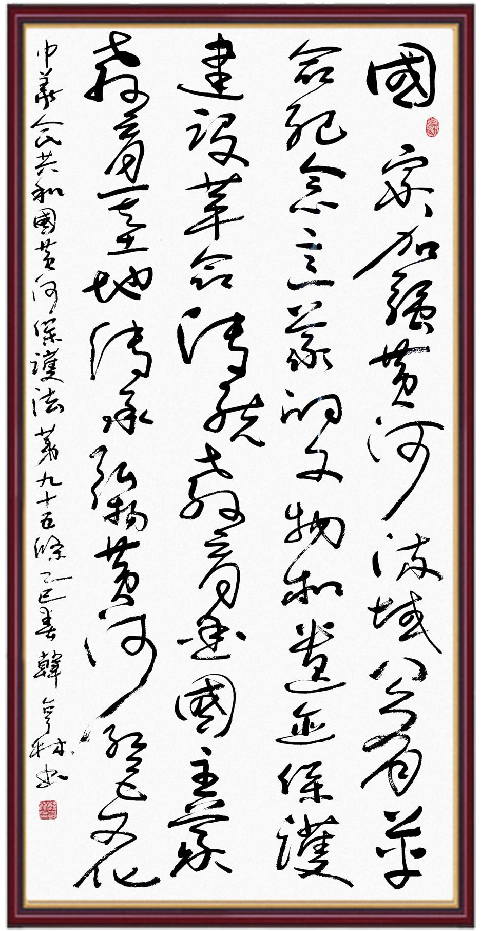 黃河寧,天下平。黃河是中華民族的發(fā)源地和搖籃,保護黃河是事關中華民族偉大復興的千秋大計?!吨腥A人民共和國黃河保護法》為推進水資源節(jié)約集約利用、保護傳承弘揚黃河文化、推動黃河流域生態(tài)保護和高質(zhì)量發(fā)展提供了有力法治保障。繼書寫《中華人民共和國民法典》《中華人民共和國憲法》《中華人民共和國澳門特別行政區(qū)基本法》《中華人民共和國香港特別行政區(qū)基本法》《中華人民共和國國旗法》《中華人民共和國國徽法》《中華人民共和國國歌法》《中華人民共和國法官法》等法律法規(guī)之后,法制日報社聯(lián)合沿黃九?。▍^(qū))司法廳、書法家協(xié)會,將筆端對準《中華人民共和國黃河保護法》。