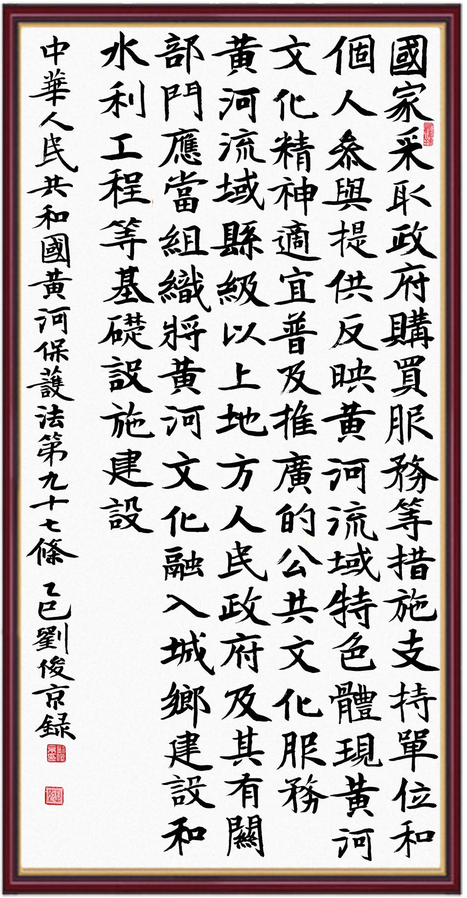 黃河寧,天下平。黃河是中華民族的發(fā)源地和搖籃,保護黃河是事關中華民族偉大復興的千秋大計。《中華人民共和國黃河保護法》為推進水資源節(jié)約集約利用、保護傳承弘揚黃河文化、推動黃河流域生態(tài)保護和高質量發(fā)展提供了有力法治保障。繼書寫《中華人民共和國民法典》《中華人民共和國憲法》《中華人民共和國澳門特別行政區(qū)基本法》《中華人民共和國香港特別行政區(qū)基本法》《中華人民共和國國旗法》《中華人民共和國國徽法》《中華人民共和國國歌法》《中華人民共和國法官法》等法律法規(guī)之后,法制日報社聯(lián)合沿黃九?。▍^(qū))司法廳、書法家協(xié)會,將筆端對準《中華人民共和國黃河保護法》。