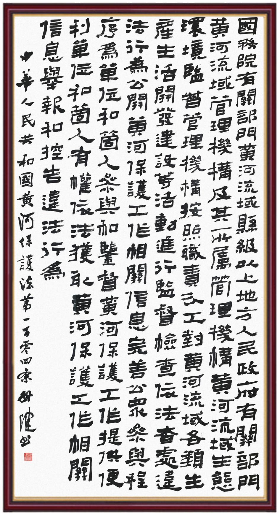 黃河寧,天下平。黃河是中華民族的發(fā)源地和搖籃,保護黃河是事關(guān)中華民族偉大復(fù)興的千秋大計。《中華人民共和國黃河保護法》為推進水資源節(jié)約集約利用、保護傳承弘揚黃河文化、推動黃河流域生態(tài)保護和高質(zhì)量發(fā)展提供了有力法治保障。繼書寫《中華人民共和國民法典》《中華人民共和國憲法》《中華人民共和國澳門特別行政區(qū)基本法》《中華人民共和國香港特別行政區(qū)基本法》《中華人民共和國國旗法》《中華人民共和國國徽法》《中華人民共和國國歌法》《中華人民共和國法官法》等法律法規(guī)之后,法制日報社聯(lián)合沿黃九?。▍^(qū))司法廳、書法家協(xié)會,將筆端對準《中華人民共和國黃河保護法》。