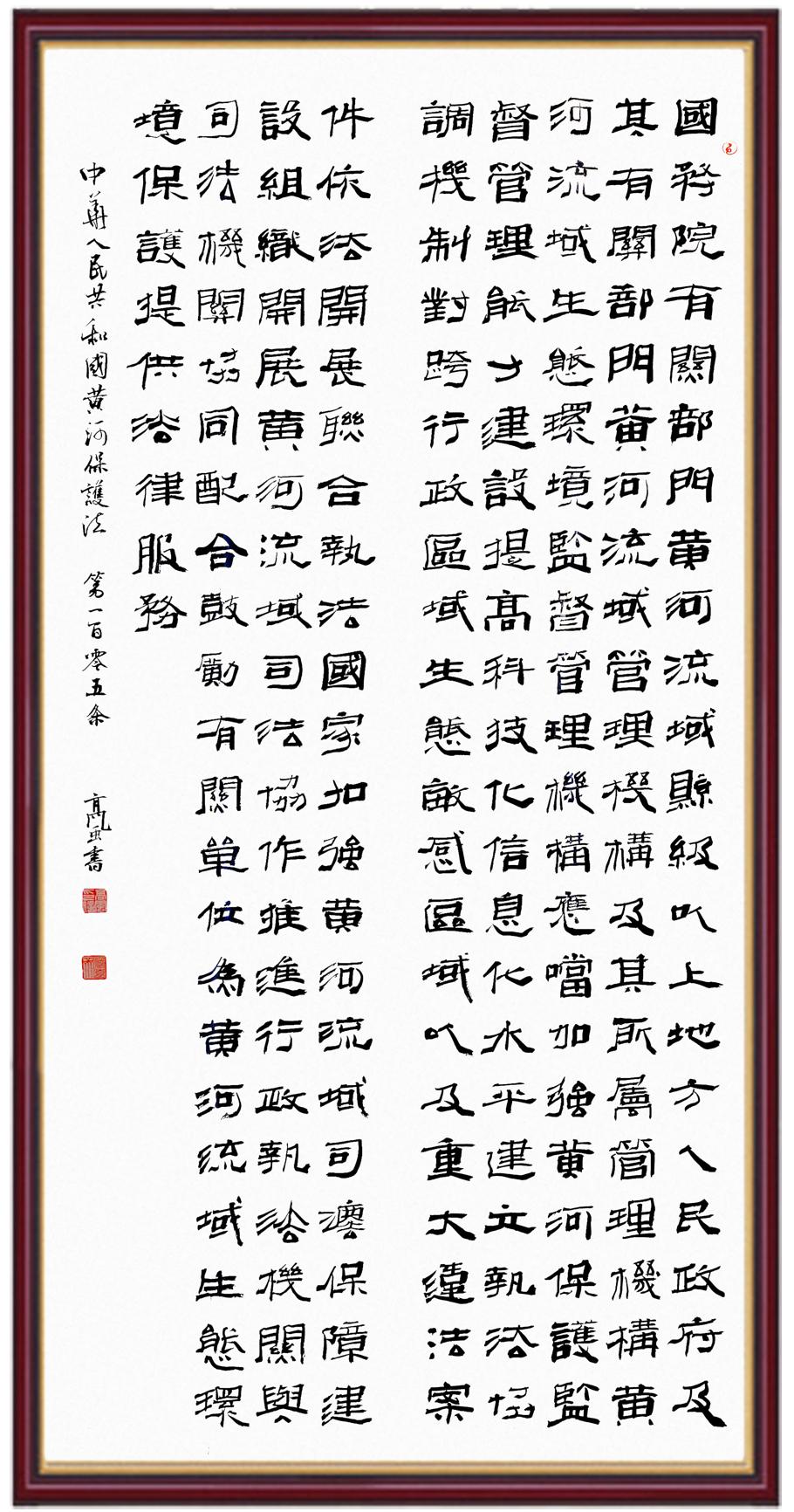 黃河寧,天下平。黃河是中華民族的發(fā)源地和搖籃,保護(hù)黃河是事關(guān)中華民族偉大復(fù)興的千秋大計?!吨腥A人民共和國黃河保護(hù)法》為推進(jìn)水資源節(jié)約集約利用、保護(hù)傳承弘揚黃河文化、推動黃河流域生態(tài)保護(hù)和高質(zhì)量發(fā)展提供了有力法治保障。繼書寫《中華人民共和國民法典》《中華人民共和國憲法》《中華人民共和國澳門特別行政區(qū)基本法》《中華人民共和國香港特別行政區(qū)基本法》《中華人民共和國國旗法》《中華人民共和國國徽法》《中華人民共和國國歌法》《中華人民共和國法官法》等法律法規(guī)之后,法制日報社聯(lián)合沿黃九省(區(qū))司法廳、書法家協(xié)會,將筆端對準(zhǔn)《中華人民共和國黃河保護(hù)法》。
