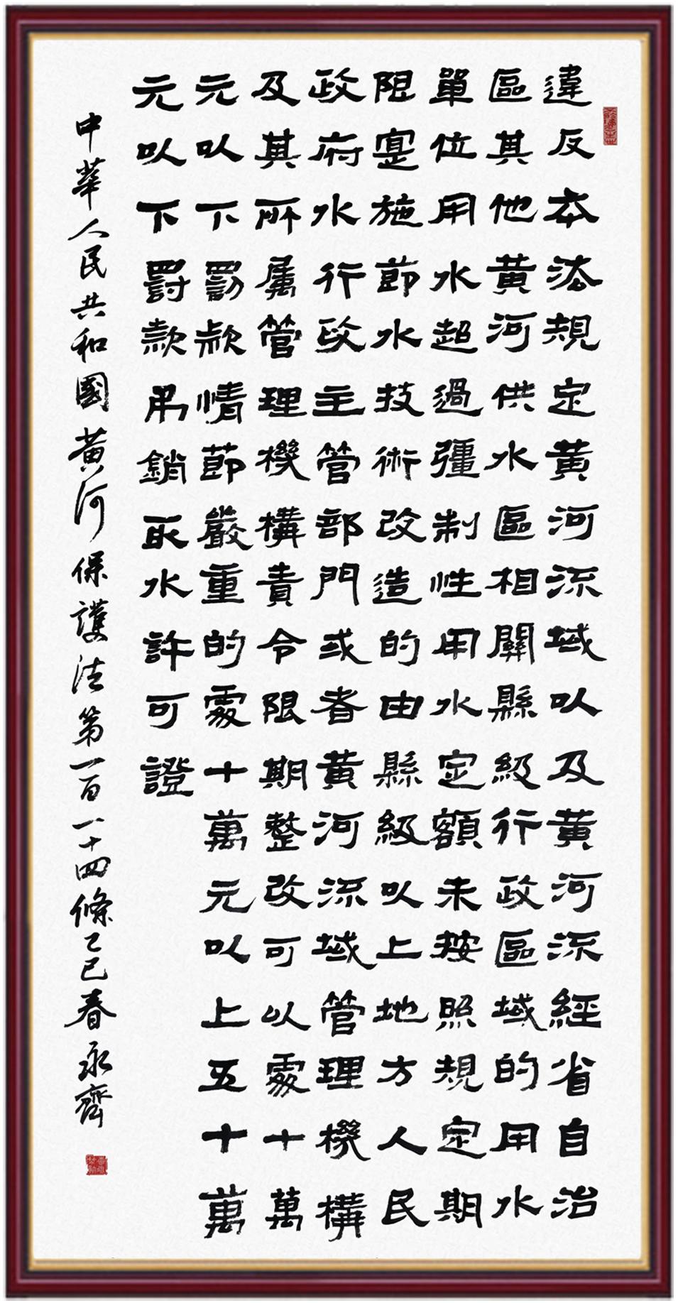 黃河寧,天下平。黃河是中華民族的發(fā)源地和搖籃,保護(hù)黃河是事關(guān)中華民族偉大復(fù)興的千秋大計(jì)。《中華人民共和國(guó)黃河保護(hù)法》為推進(jìn)水資源節(jié)約集約利用、保護(hù)傳承弘揚(yáng)黃河文化、推動(dòng)黃河流域生態(tài)保護(hù)和高質(zhì)量發(fā)展提供了有力法治保障。繼書寫《中華人民共和國(guó)民法典》《中華人民共和國(guó)憲法》《中華人民共和國(guó)澳門特別行政區(qū)基本法》《中華人民共和國(guó)香港特別行政區(qū)基本法》《中華人民共和國(guó)國(guó)旗法》《中華人民共和國(guó)國(guó)徽法》《中華人民共和國(guó)國(guó)歌法》《中華人民共和國(guó)法官法》等法律法規(guī)之后,法制日?qǐng)?bào)社聯(lián)合沿黃九?。▍^(qū))司法廳、書法家協(xié)會(huì),將筆端對(duì)準(zhǔn)《中華人民共和國(guó)黃河保護(hù)法》。