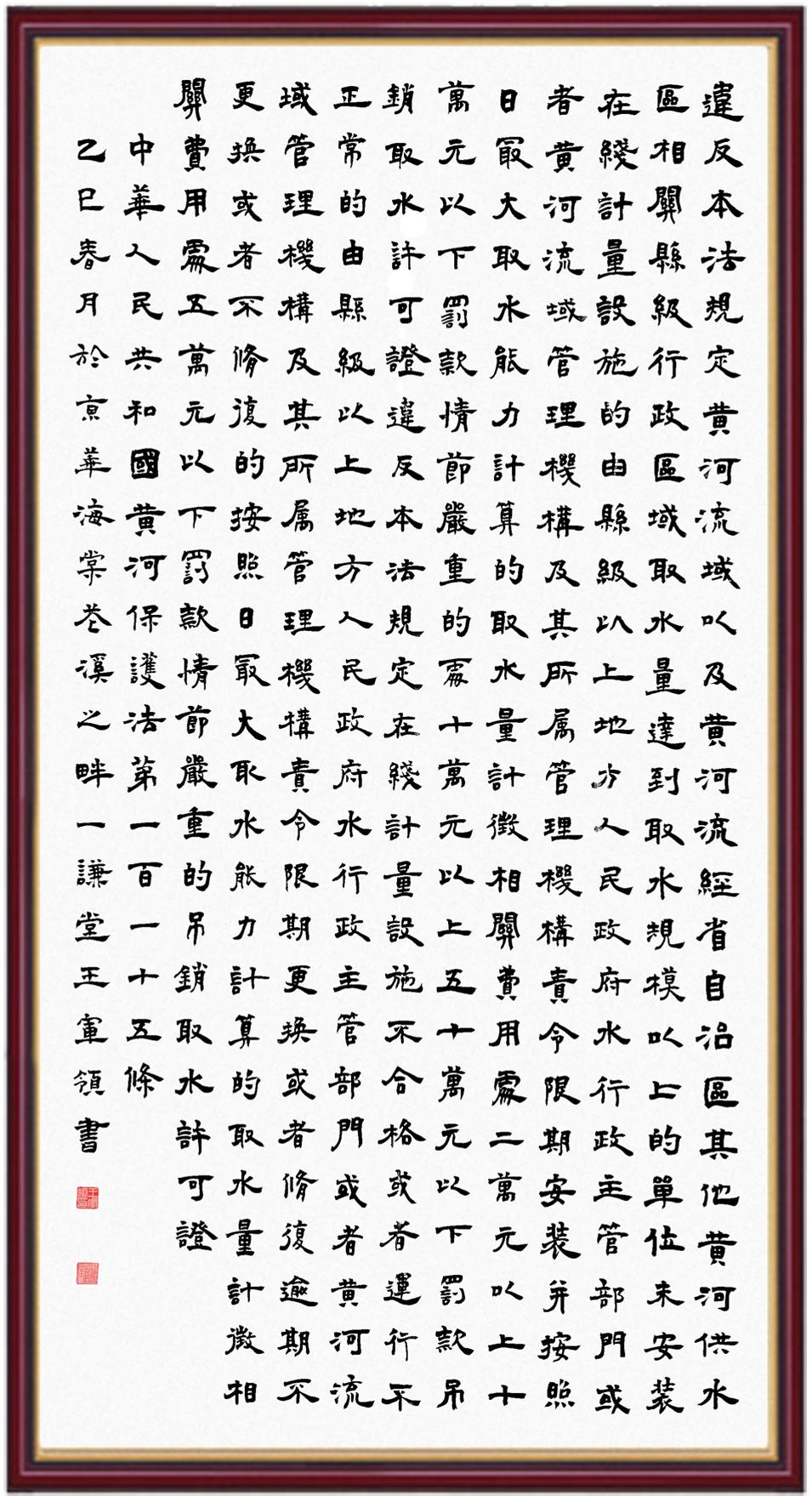 黃河寧,天下平。黃河是中華民族的發(fā)源地和搖籃,保護(hù)黃河是事關(guān)中華民族偉大復(fù)興的千秋大計(jì)?!吨腥A人民共和國黃河保護(hù)法》為推進(jìn)水資源節(jié)約集約利用、保護(hù)傳承弘揚(yáng)黃河文化、推動(dòng)黃河流域生態(tài)保護(hù)和高質(zhì)量發(fā)展提供了有力法治保障。繼書寫《中華人民共和國民法典》《中華人民共和國憲法》《中華人民共和國澳門特別行政區(qū)基本法》《中華人民共和國香港特別行政區(qū)基本法》《中華人民共和國國旗法》《中華人民共和國國徽法》《中華人民共和國國歌法》《中華人民共和國法官法》等法律法規(guī)之后,法制日報(bào)社聯(lián)合沿黃九?。▍^(qū))司法廳、書法家協(xié)會(huì),將筆端對準(zhǔn)《中華人民共和國黃河保護(hù)法》。