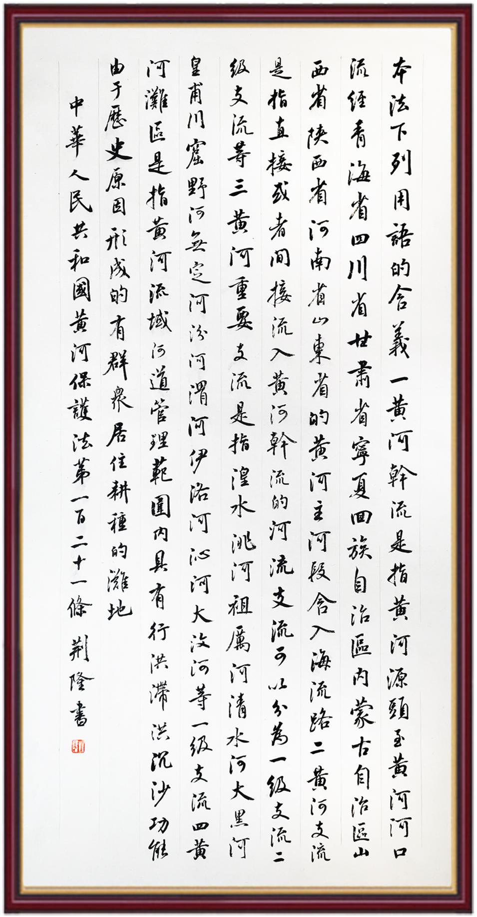 黃河寧,天下平。黃河是中華民族的發(fā)源地和搖籃,保護(hù)黃河是事關(guān)中華民族偉大復(fù)興的千秋大計(jì)。《中華人民共和國(guó)黃河保護(hù)法》為推進(jìn)水資源節(jié)約集約利用、保護(hù)傳承弘揚(yáng)黃河文化、推動(dòng)黃河流域生態(tài)保護(hù)和高質(zhì)量發(fā)展提供了有力法治保障。繼書(shū)寫(xiě)《中華人民共和國(guó)民法典》《中華人民共和國(guó)憲法》《中華人民共和國(guó)澳門(mén)特別行政區(qū)基本法》《中華人民共和國(guó)香港特別行政區(qū)基本法》《中華人民共和國(guó)國(guó)旗法》《中華人民共和國(guó)國(guó)徽法》《中華人民共和國(guó)國(guó)歌法》《中華人民共和國(guó)法官法》等法律法規(guī)之后,法制日?qǐng)?bào)社聯(lián)合沿黃九?。▍^(qū))司法廳、書(shū)法家協(xié)會(huì),將筆端對(duì)準(zhǔn)《中華人民共和國(guó)黃河保護(hù)法》。