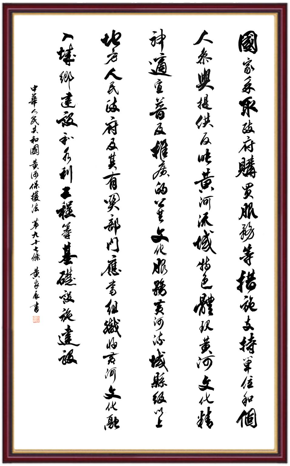 黃河寧,天下平。黃河是中華民族的發(fā)源地和搖籃,保護(hù)黃河是事關(guān)中華民族偉大復(fù)興的千秋大計?!吨腥A人民共和國黃河保護(hù)法》為推進(jìn)水資源節(jié)約集約利用、保護(hù)傳承弘揚黃河文化、推動黃河流域生態(tài)保護(hù)和高質(zhì)量發(fā)展提供了有力法治保障。繼書寫《中華人民共和國民法典》《中華人民共和國憲法》《中華人民共和國澳門特別行政區(qū)基本法》《中華人民共和國香港特別行政區(qū)基本法》《中華人民共和國國旗法》《中華人民共和國國徽法》《中華人民共和國國歌法》《中華人民共和國法官法》等法律法規(guī)之后,法制日報社聯(lián)合沿黃九?。▍^(qū))司法廳、書法家協(xié)會,將筆端對準(zhǔn)《中華人民共和國黃河保護(hù)法》。