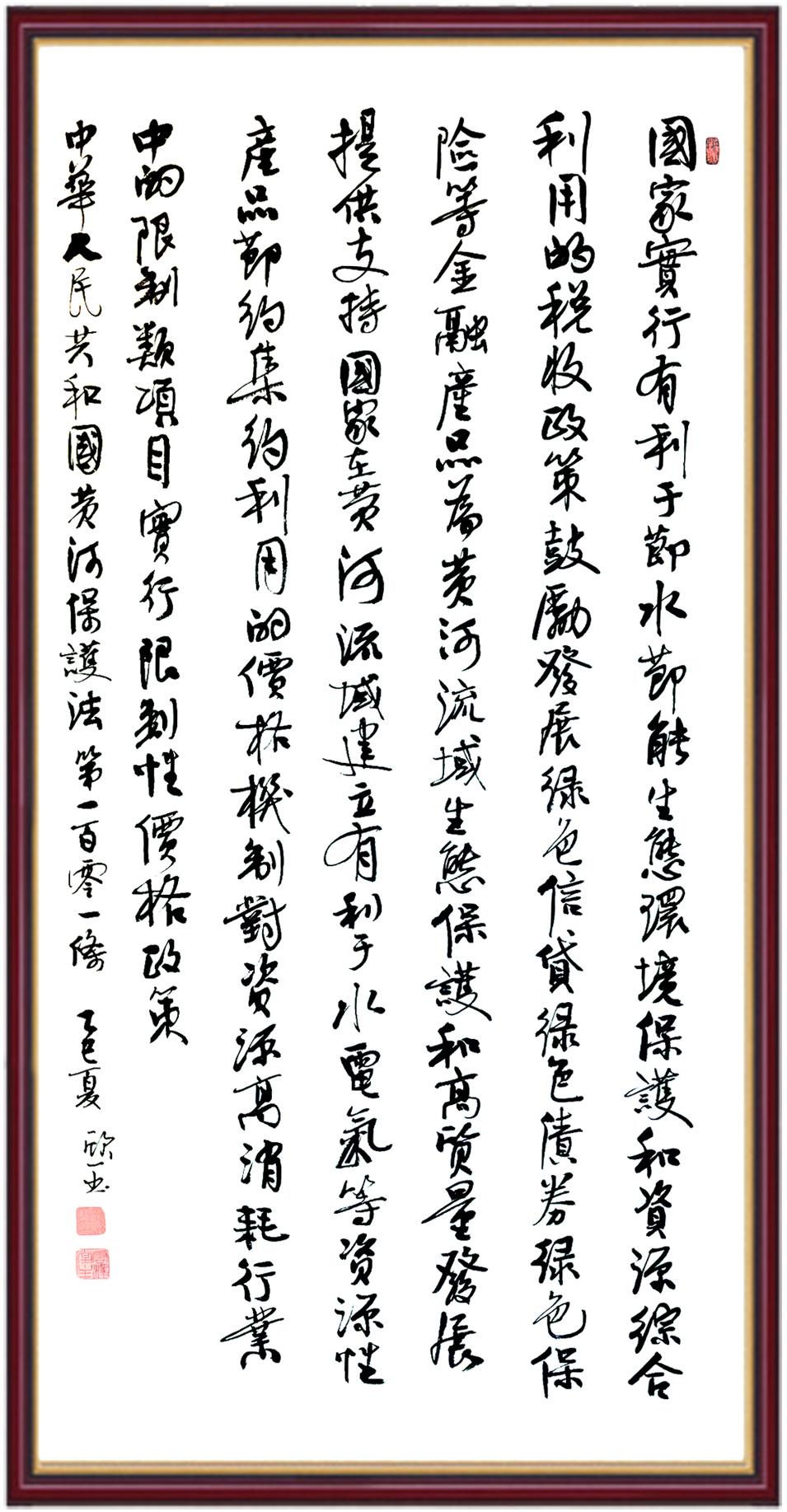 黃河寧,天下平。黃河是中華民族的發(fā)源地和搖籃,保護黃河是事關(guān)中華民族偉大復(fù)興的千秋大計?!吨腥A人民共和國黃河保護法》為推進水資源節(jié)約集約利用、保護傳承弘揚黃河文化、推動黃河流域生態(tài)保護和高質(zhì)量發(fā)展提供了有力法治保障。繼書寫《中華人民共和國民法典》《中華人民共和國憲法》《中華人民共和國澳門特別行政區(qū)基本法》《中華人民共和國香港特別行政區(qū)基本法》《中華人民共和國國旗法》《中華人民共和國國徽法》《中華人民共和國國歌法》《中華人民共和國法官法》等法律法規(guī)之后,法制日報社聯(lián)合沿黃九?。▍^(qū))司法廳、書法家協(xié)會,將筆端對準《中華人民共和國黃河保護法》。