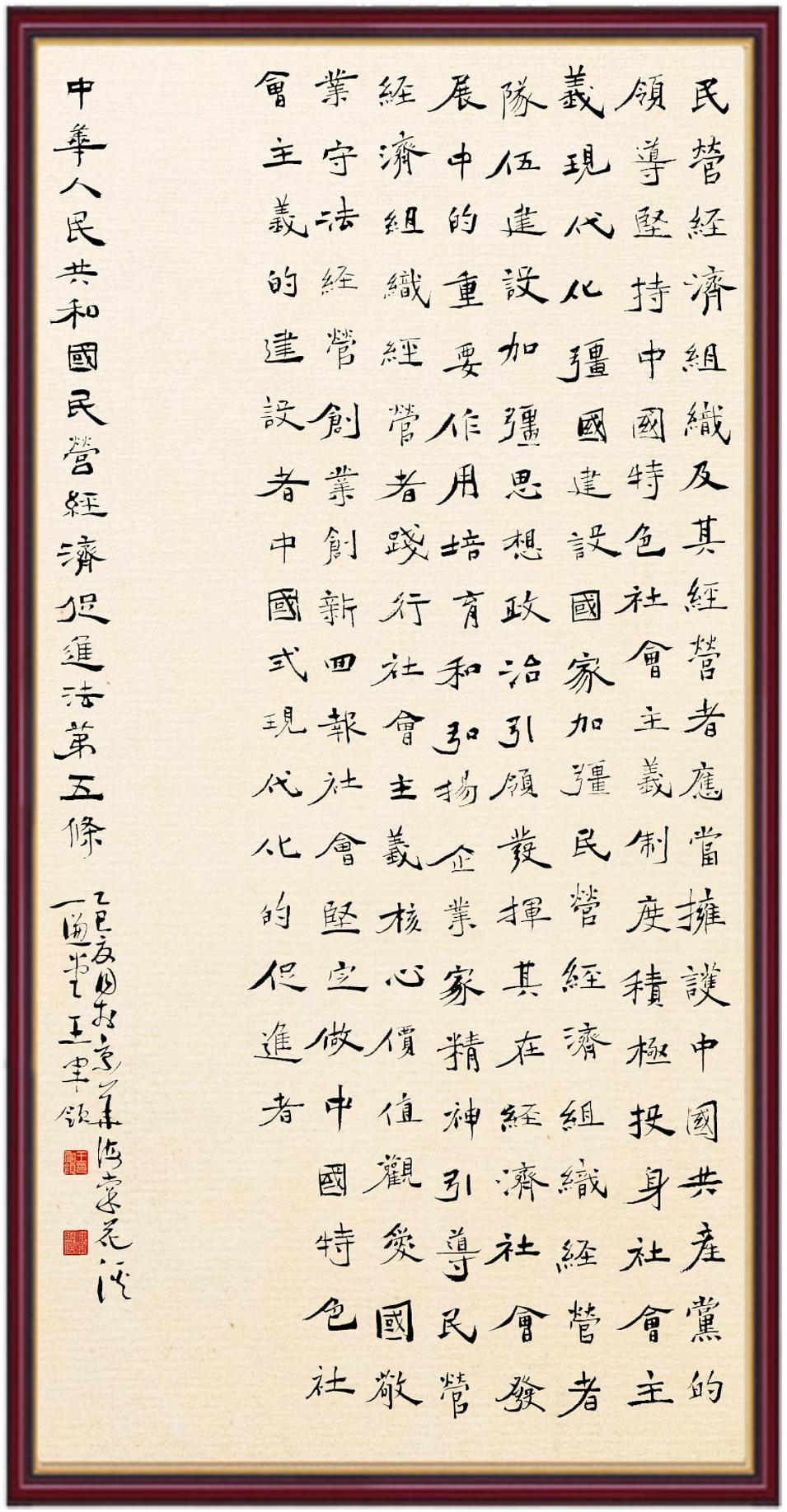 《中華人民共和國(guó)民營(yíng)經(jīng)濟(jì)促進(jìn)法》自今年5月20日起施行。作為我國(guó)首部專門關(guān)于民營(yíng)經(jīng)濟(jì)發(fā)展的基礎(chǔ)性法律,民營(yíng)經(jīng)濟(jì)促進(jìn)法將支持和保障民營(yíng)經(jīng)濟(jì)發(fā)展的法律制度融入中國(guó)特色社會(huì)主義法律體系,具有重大的法治意義,為促進(jìn)民營(yíng)經(jīng)濟(jì)持續(xù)、健康、高質(zhì)量發(fā)展提供了堅(jiān)實(shí)的法治保障。為更好地學(xué)習(xí)、宣傳、貫徹這部法律,法治日?qǐng)?bào)社聯(lián)合司法部普法與依法治理局,開展“‘書·法’系列活動(dòng)之書寫《中華人民共和國(guó)民營(yíng)經(jīng)濟(jì)促進(jìn)法》”活動(dòng)。
