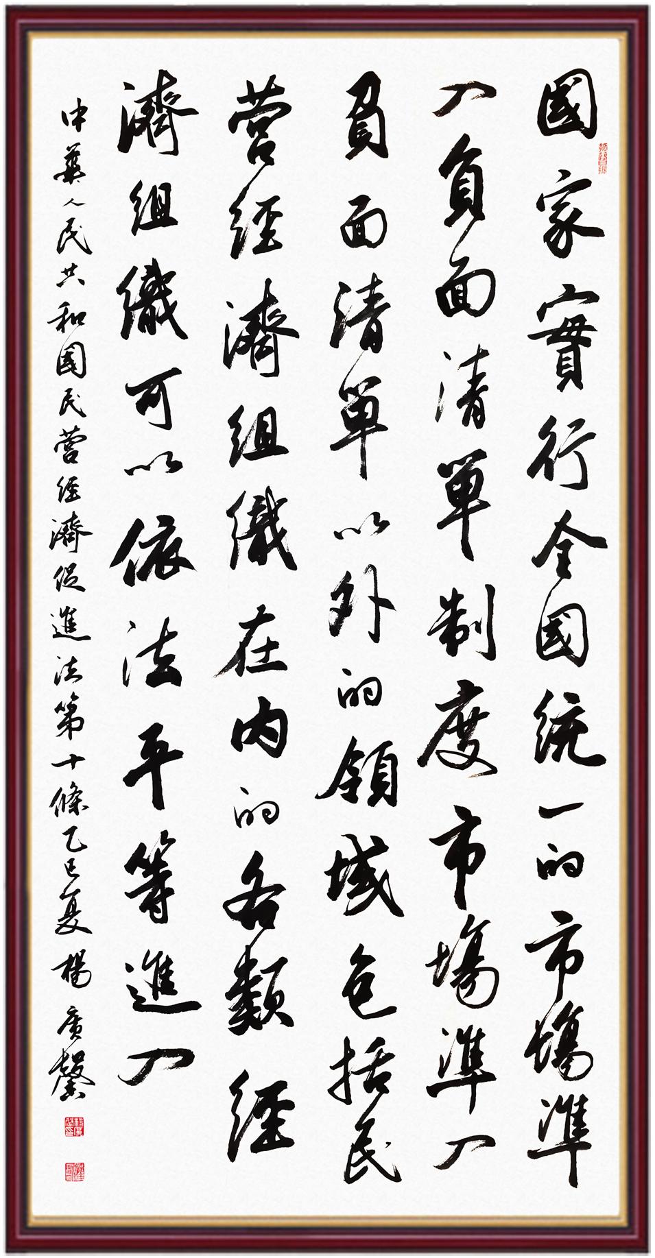《中華人民共和國(guó)民營(yíng)經(jīng)濟(jì)促進(jìn)法》自今年5月20日起施行。作為我國(guó)首部專門關(guān)于民營(yíng)經(jīng)濟(jì)發(fā)展的基礎(chǔ)性法律,民營(yíng)經(jīng)濟(jì)促進(jìn)法將支持和保障民營(yíng)經(jīng)濟(jì)發(fā)展的法律制度融入中國(guó)特色社會(huì)主義法律體系,具有重大的法治意義,為促進(jìn)民營(yíng)經(jīng)濟(jì)持續(xù)、健康、高質(zhì)量發(fā)展提供了堅(jiān)實(shí)的法治保障。為更好地學(xué)習(xí)、宣傳、貫徹這部法律,法治日?qǐng)?bào)社聯(lián)合司法部普法與依法治理局,開展“‘書·法’系列活動(dòng)之書寫《中華人民共和國(guó)民營(yíng)經(jīng)濟(jì)促進(jìn)法》”活動(dòng)。