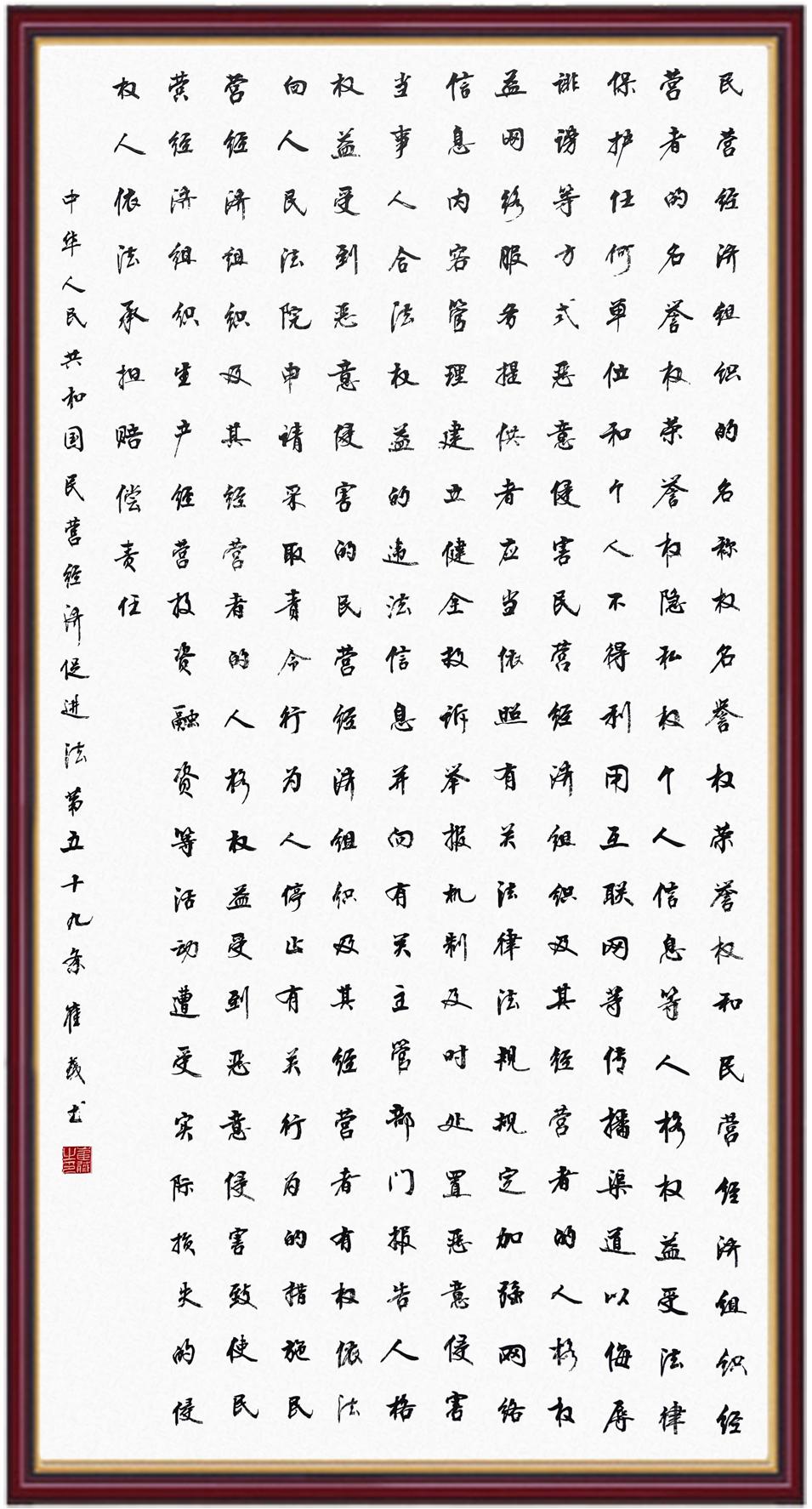 《中華人民共和國民營經(jīng)濟促進法》自今年5月20日起施行。作為我國首部專門關(guān)于民營經(jīng)濟發(fā)展的基礎(chǔ)性法律,民營經(jīng)濟促進法將支持和保障民營經(jīng)濟發(fā)展的法律制度融入中國特色社會主義法律體系,具有重大的法治意義,為促進民營經(jīng)濟持續(xù)、健康、高質(zhì)量發(fā)展提供了堅實的法治保障。為更好地學(xué)習(xí)、宣傳、貫徹這部法律,法治日報社聯(lián)合司法部普法與依法治理局,開展“‘書·法’系列活動之書寫《中華人民共和國民營經(jīng)濟促進法》”活動。