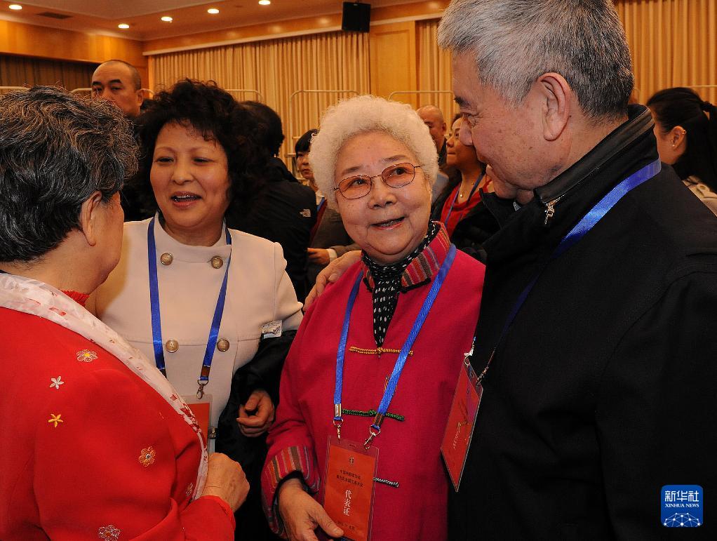 2013年11月29日,中國(guó)電影家協(xié)會(huì)第九次全國(guó)代表大會(huì)在北京開(kāi)幕。這是田華(右二)在會(huì)議間隙與其他代表交流。新華社記者 何俊昌 攝