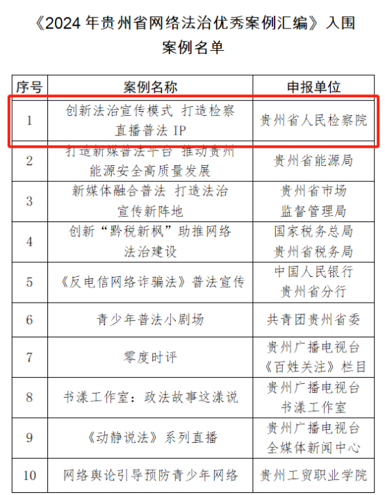 由貴州省委網信辦主辦的2024年貴州省網絡法治優(yōu)秀案例征集活動結果日前揭曉,貴州省人民檢察院的《創(chuàng)新法治宣傳模式 打造檢察直播普法IP》普法宣傳案例成功入選。
