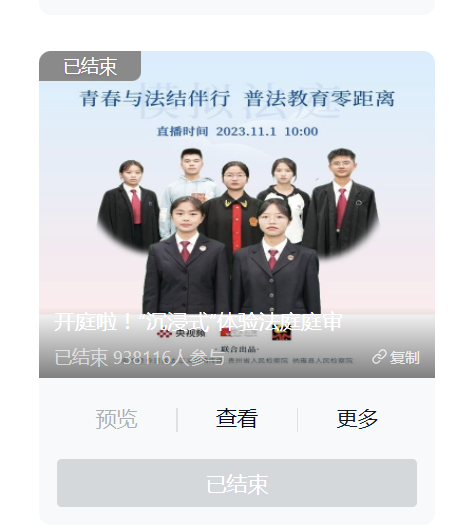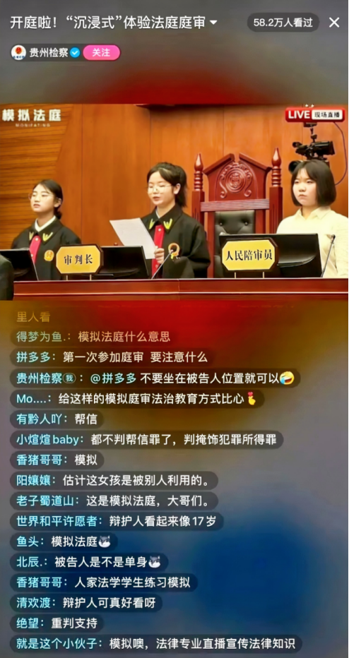 貴州省人民檢察院傾力打造“我是檢察官·直播間”原創(chuàng)普法IP,聯(lián)合黨政機關、學校等開展普法活動,打造“檢察官+”普法宣傳模式,通過模擬法庭、專家講解、互動答疑等形式,將司法實踐與線上直播結合,讓法律知識“活”起來,群眾可以沉浸式體驗“司法活動”和“檢察辦案”等。