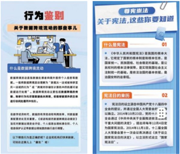 圍繞重點(diǎn)法規(guī)、重要時(shí)間節(jié)點(diǎn),做好權(quán)威內(nèi)容轉(zhuǎn)化,推出多形式的法宣產(chǎn)品、交互活動(dòng),從單向式教育向互動(dòng)式、服務(wù)式、場(chǎng)景式傳播轉(zhuǎn)變。