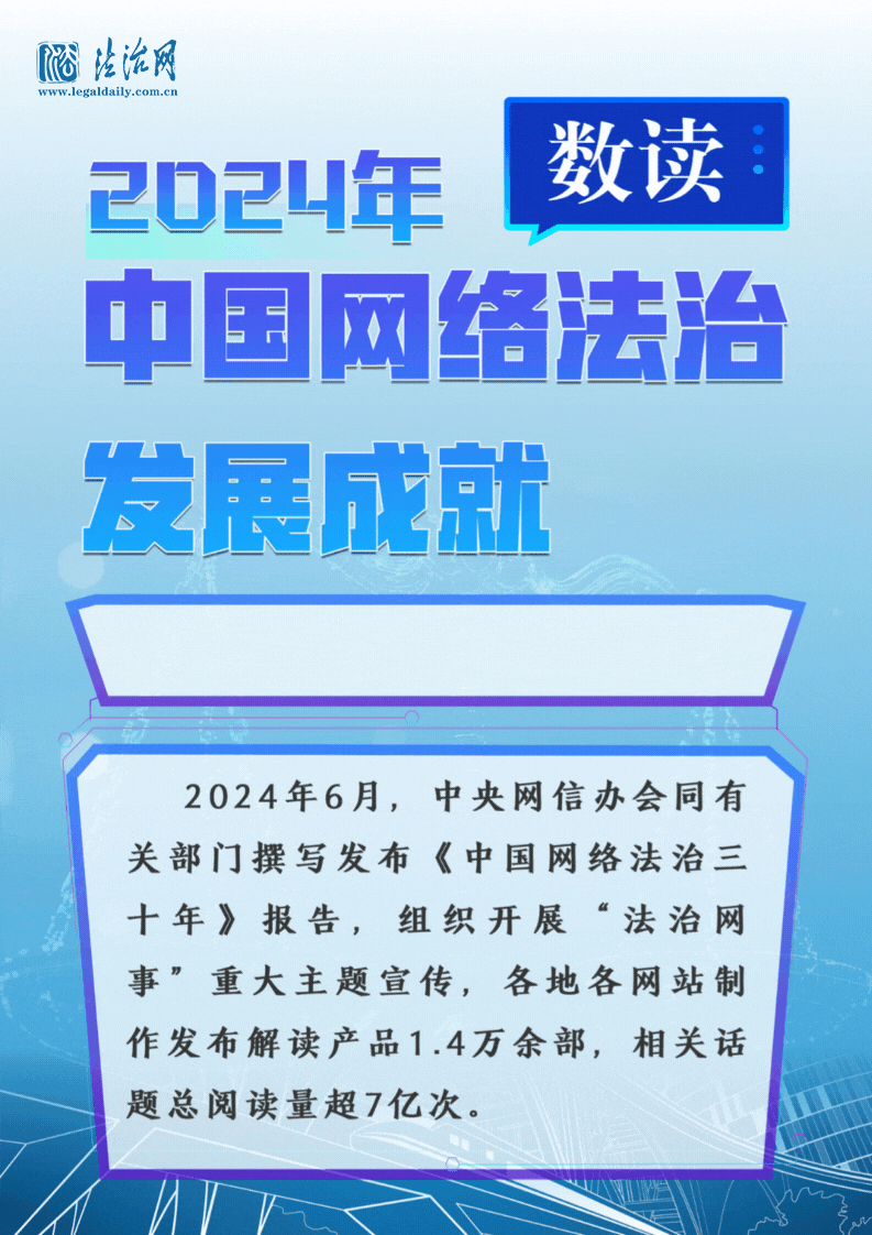 4月27日,國(guó)家互聯(lián)網(wǎng)信息辦公室發(fā)布《中國(guó)網(wǎng)絡(luò)法治發(fā)展報(bào)告(2024年)》。這是首部國(guó)家部門(mén)層面發(fā)布的網(wǎng)絡(luò)法治綜合性年度報(bào)告,既是《中國(guó)網(wǎng)絡(luò)法治三十年》報(bào)告的續(xù)篇,也是中國(guó)網(wǎng)絡(luò)法治發(fā)展年度報(bào)告的開(kāi)篇。讓我們用一組數(shù)據(jù)帶你看我國(guó)網(wǎng)絡(luò)法治建設(shè)這一年的成就,感受網(wǎng)絡(luò)法治建設(shè)邁出的堅(jiān)實(shí)步伐。