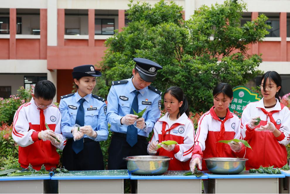 活動(dòng)現(xiàn)場(chǎng),民警與學(xué)生們圍坐在一起,手把手教孩子們包粽子?!棒杖~要折成漏斗狀,米不能放太多,就像法律給我們的保護(hù),既要周全也要適度?!泵窬贿吺痉叮贿厡⒚穹ǖ渲信c未成年人相關(guān)的條款融入講解。小小的粽子裹進(jìn)了防霸凌、防溺水的小貼士,孩子們?cè)隗w驗(yàn)傳統(tǒng)文化的同時(shí),潛移默化地學(xué)習(xí)了法律知識(shí)。
