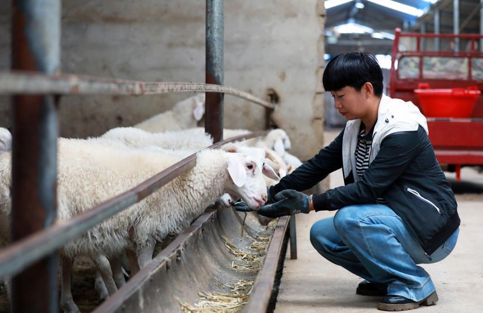 在富民新村養(yǎng)殖區(qū)的養(yǎng)殖暖棚內(nèi),養(yǎng)殖戶蒲萬林在查看肉羊長(zhǎng)勢(shì)。新華社記者 郭剛 攝