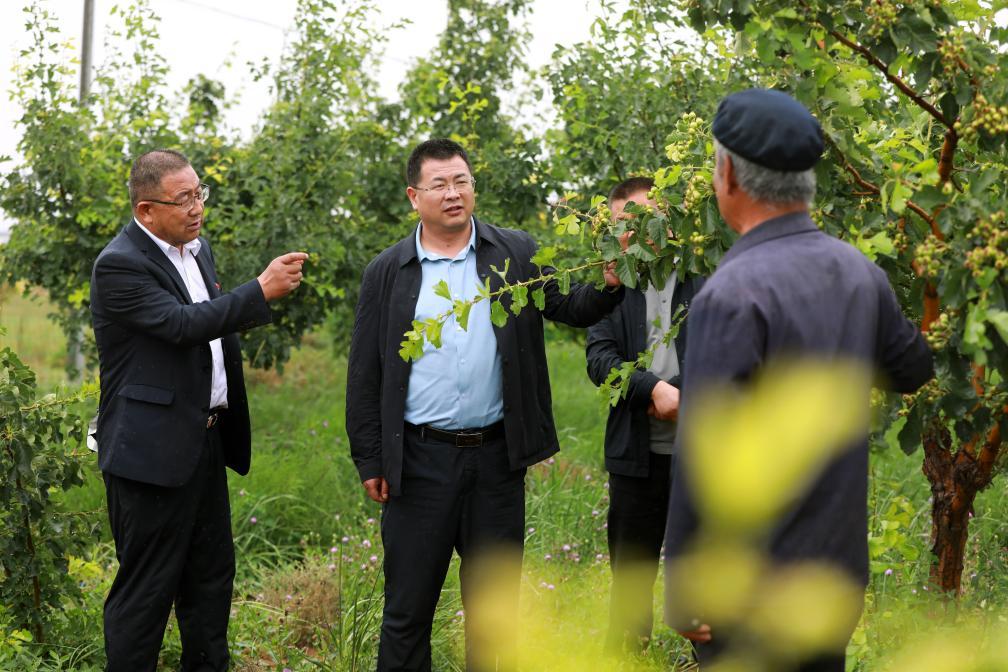 在富民新村的經(jīng)濟(jì)林栽植區(qū),古浪縣委組織部常務(wù)副部長(zhǎng)俞永文(左二)與富民新村黨委書記兼村委會(huì)主任張延堂(左一)在和種植戶交流。新華社記者 郭剛 攝