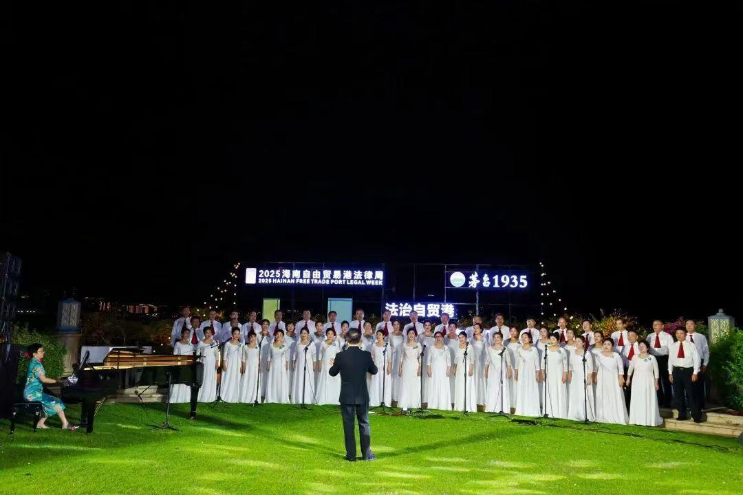 活動在海南律師合唱團帶來的混聲合唱《萬泉河水清又清》中拉開序幕,經(jīng)典旋律與濱海夜色交相輝映,令人心潮澎湃。接著,《傳奇》《領(lǐng)航》等歌曲依次上演,展現(xiàn)出海南律師隊伍精湛的合唱功底和昂揚向上的精神風貌;女聲合唱《世界贈予我的》《漁家姑娘在海邊》《花開中國》以柔美和聲描繪出海南的地域風情與時代氣息。